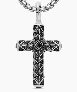 David Yurman skillfully reinterprets chevron—the ancient V-shaped pattern used in architecture and art—in this modern, sculptural collection. Viewed in relation to one another, each half of the motif is a mirror image of Cable. Sterling silverPavé black diamonds, 1.80 total carat weightCross, 47 x 25.6mmPlease note: cross only; chain sold separatelyShown with: Box Chain