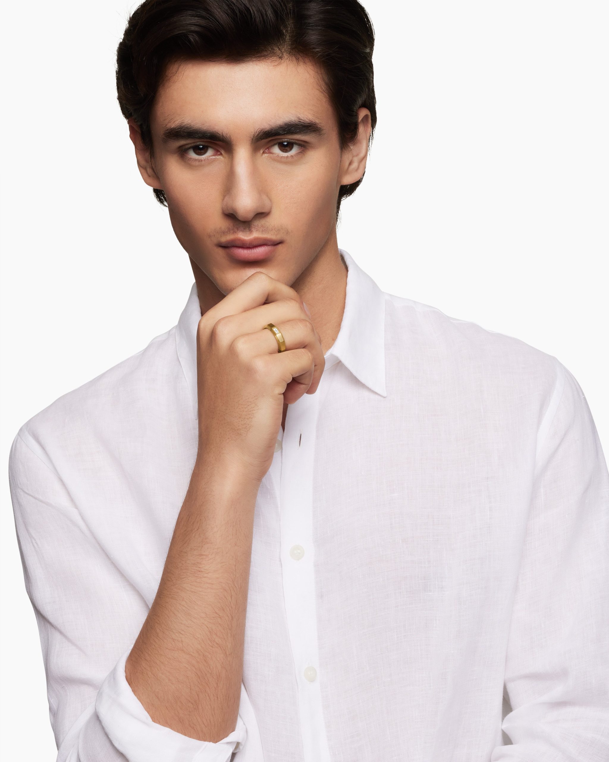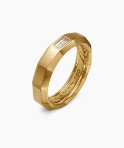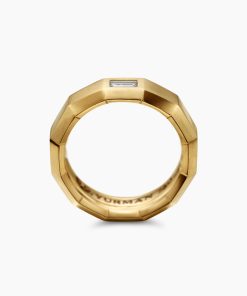 This distinctive men’s design is inspired by modern architecture. 18-karat yellow goldDiamond, 0.19 total carat weightRing, 6mmThis item can be engraved. Please contact customer care for more information.