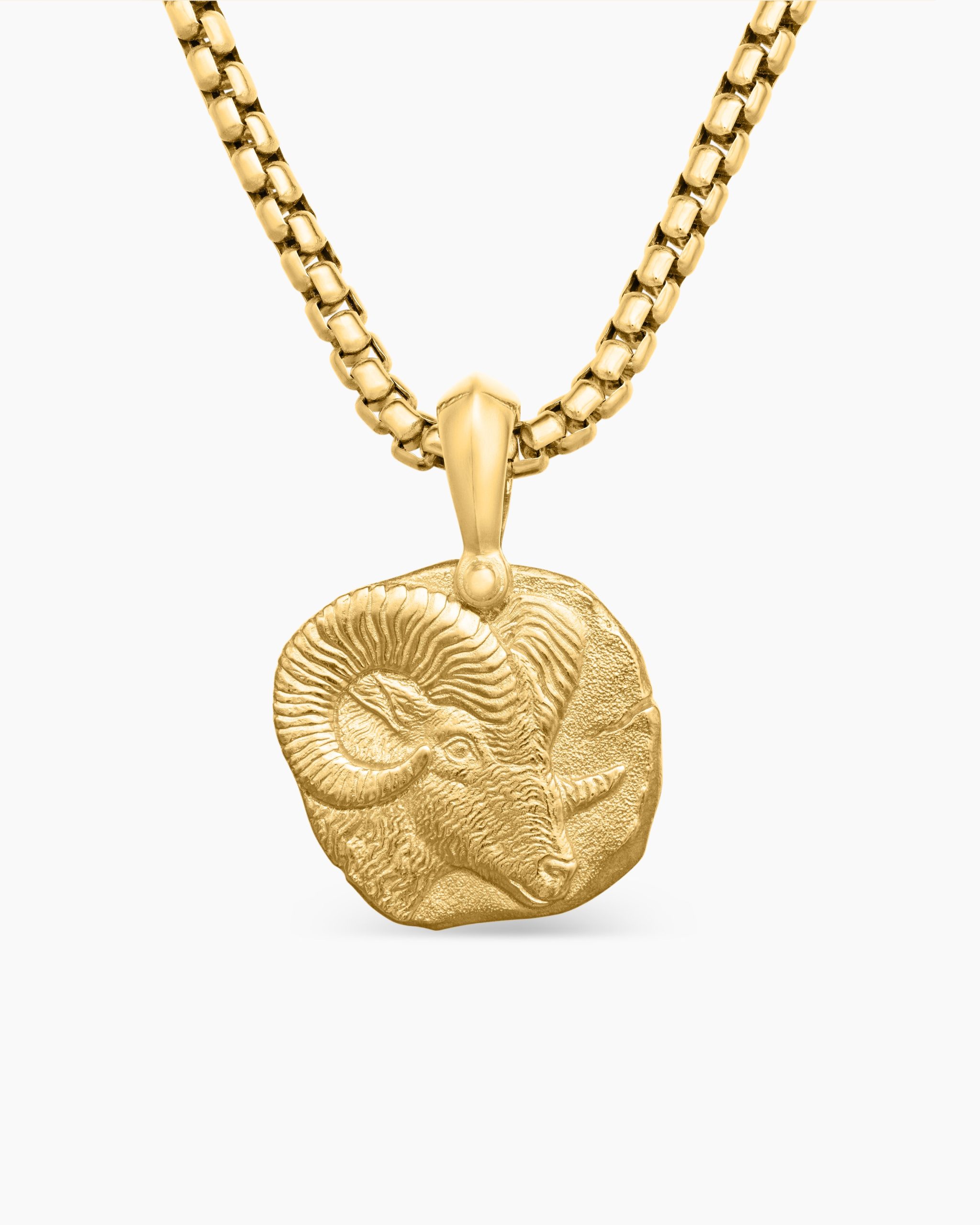 ARIESMarch 21–April 19 Symbol: RamAdventurous explorer 18-karat yellow goldAmulet, 27 x 17mmPlease note: amulet only; chain sold separately.Shown with: Box Chain