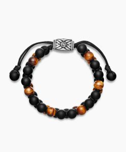 Rooted in spiritual significance, these modern beaded jewelry designs are symbolic of your inner spirit and authenticity. They are meant to be collected, layered, and worn continuously as you move through life’s journey. Expertly crafted, they feature a variety of smoothly polished, semi-precious, and rare gemstones, such as quartz, black onyx and tiger’s eye.Sterling silverBlack nylonBlack onyx and tiger’s eyeBracelet, 8mmSlider clasp
