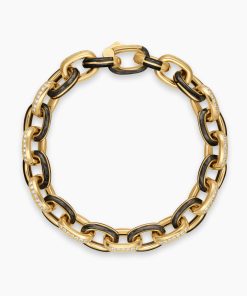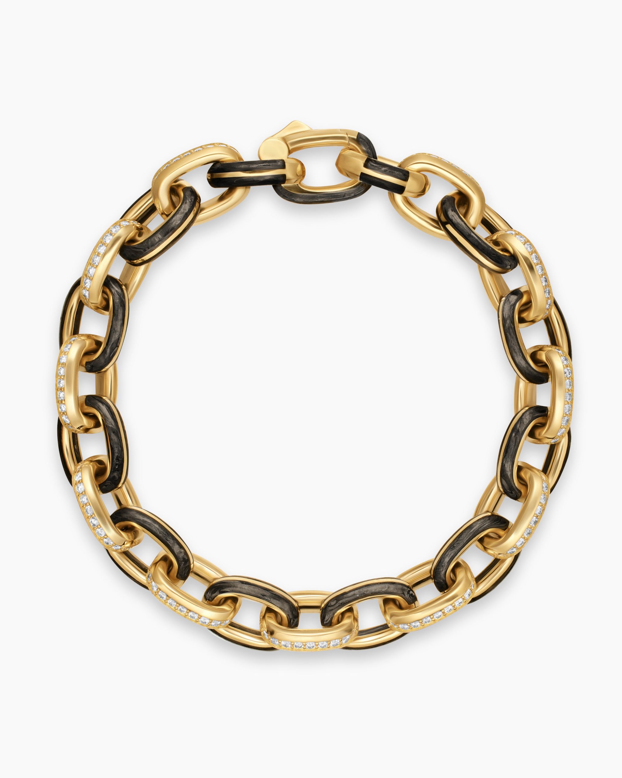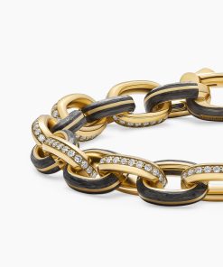Inspired by clean lines and smooth metal surfaces, these minimalist designs are sculpted with engineered precision.Forged carbon is a lightweight yet strong composite originally used in aeronautics and sports cars. For jewelry, David Yurman pioneered a technique which fuses the modern material and precious metal into innovative, graphic designs.18-karat yellow goldForged carbonPavé-set diamonds, total carat weight ranges from 3.47 to 4.17 (dependent on size)Bracelet, 10.8mmPush clasp