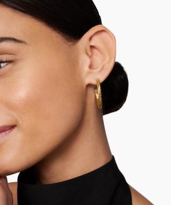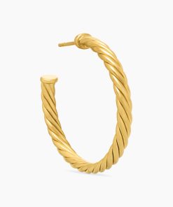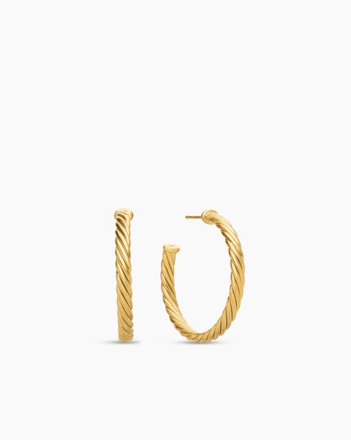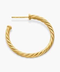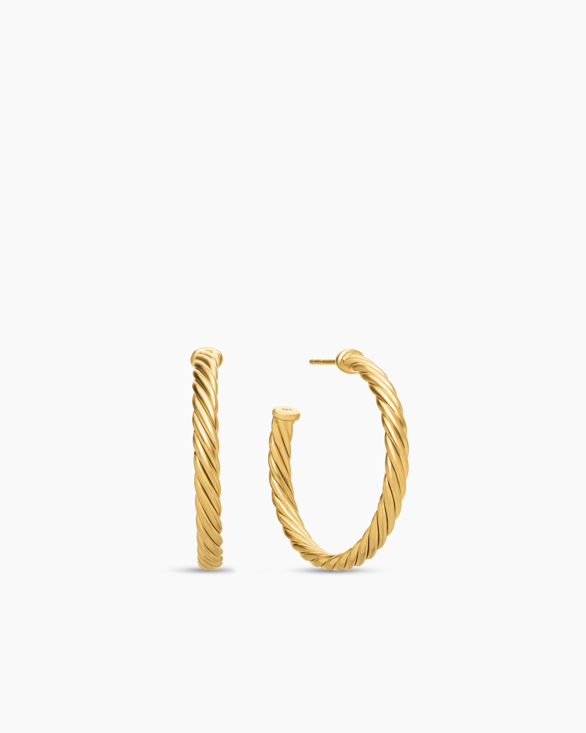 In Sculpted Cable, David Yurman transforms his signature design motif into a carved form. The effect is an entrancing wavelike pattern that retains the dimensional look of Cable’s original helix. 18-karat yellow goldHoop diameter, 1inCablespira® is a patented DY construction that is highly flexible and exceptionally comfortable to wear.