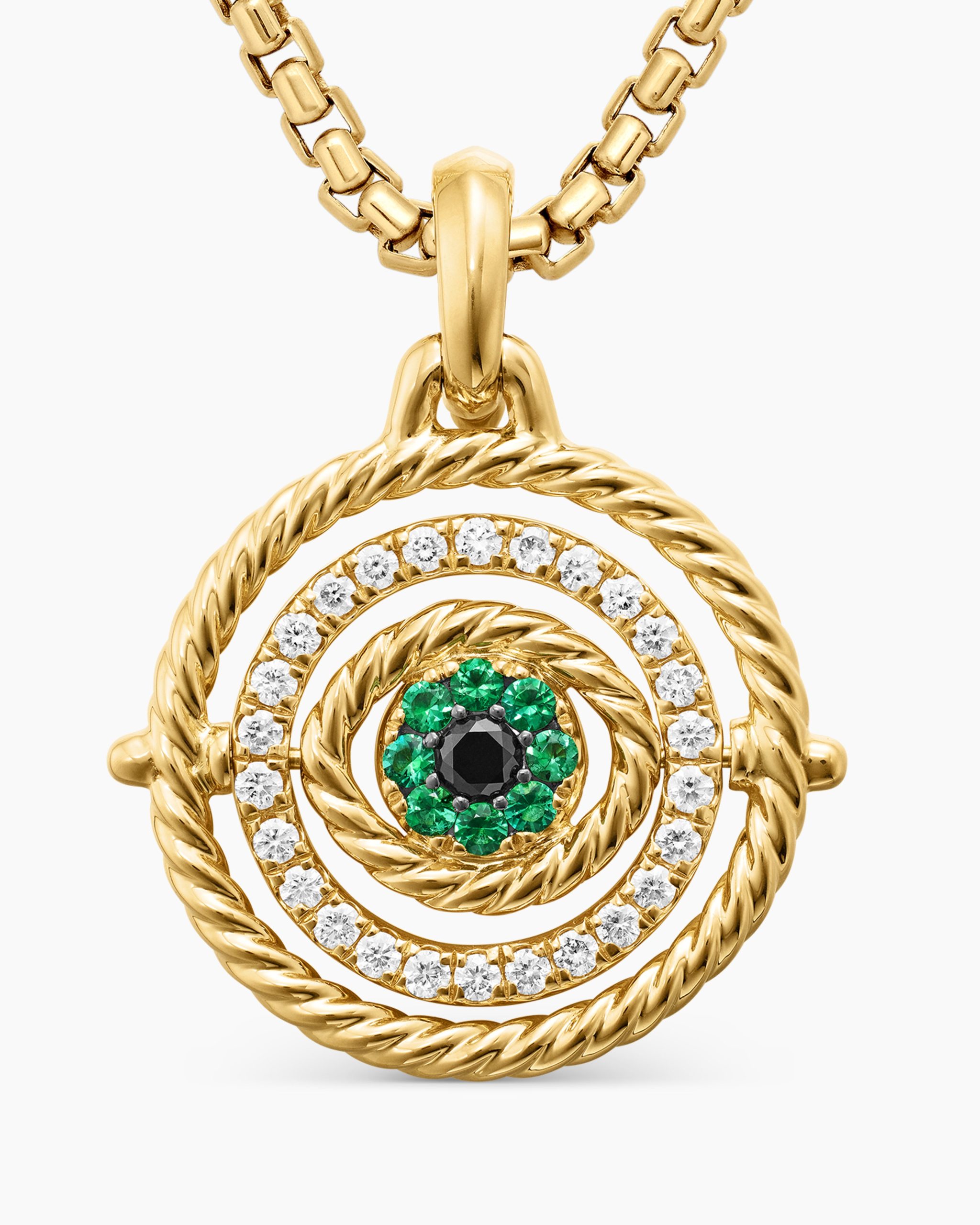 Charms and Amulets add a new layer of collectability–one that is about personalization, meaning and self-expression. The designs can be worn individually on a chain, in multiples, or added to a charm bracelet.nn nnnt18-karat yellow goldntPavé emeralds, 0.16 total carat weightntPavé diamonds, 0.31 total carat weightntPavé black diamonds, 0.07 total carat weightntAmulet, 20.5mmntFunctioning bail allows pendant to attach to a necklace or bracelet.ntPlease note: amulet only; chain sold separatelyntShown with: Box Chainn