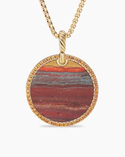 In this collection, David Yurman explores the circle—a timeless symbol of unity, a shape without beginning or end. 18-karat yellow goldJasperPavé orange sapphires, 1.63 total carat weightPendant, 32mmFunctioning bail allows pendant to attach to a necklace or bracelet.Please note: pendant only; chain sold separatelyShown with: Box Chain