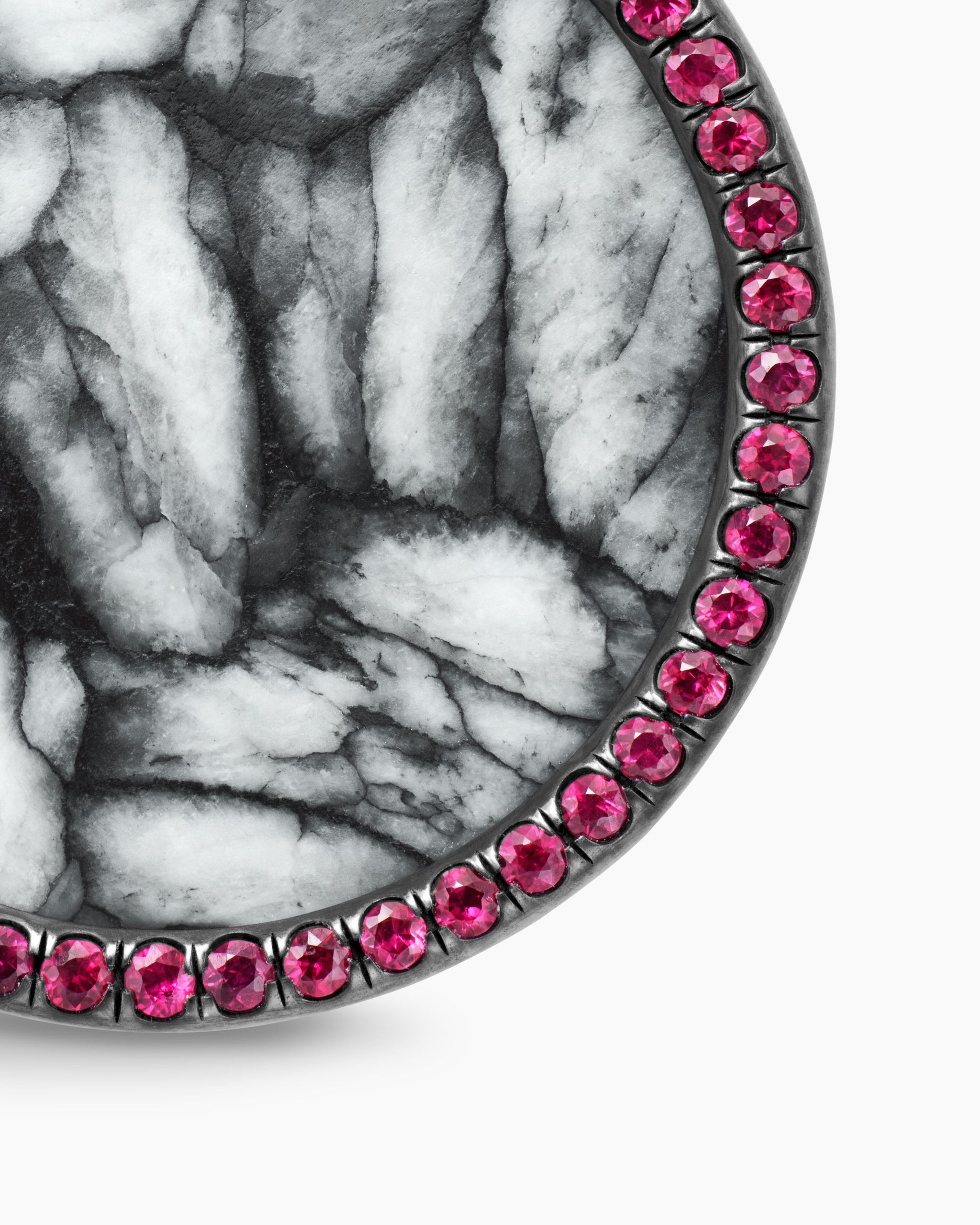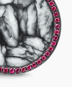 In this collection, David Yurman explores the circle—a timeless symbol of unity, a shape without beginning or end. Blackened sterling silverPinolithPavé rubies, 0.94 total carat weightPendant, 24mmFunctioning bail allows pendant to attach to a necklace or bracelet.Please note: pendant only; chain sold separatelyShown with: Box Chain