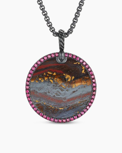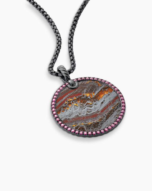 In this collection, David Yurman explores the circle—a timeless symbol of unity, a shape without beginning or end. Blackened sterling silverTiger ironPavé rubies, 1.53 total carat weightPendant, 32mmFunctioning bail allows pendant to attach to a necklace or bracelet.Please note: pendant only; chain sold separatelyShown with: Box Chain