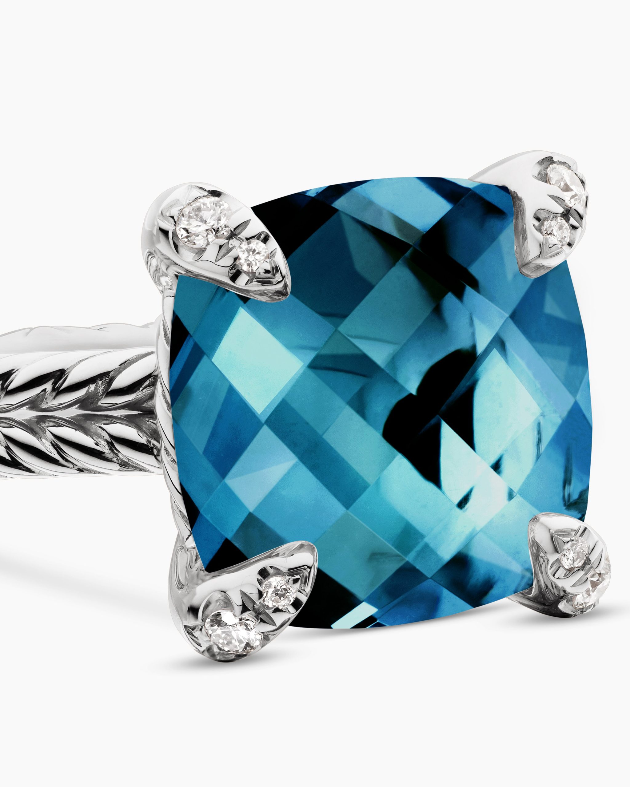 The Châtelaine® Collection is a perfect fusion of David and Sybil Yurman’s combined art—the marriage of a sculptor and a painter—form and color. Sterling silverHampton blue topaz, 6.60 total carat weightPavé diamonds, 0.05 total carat weightRing, 11mm