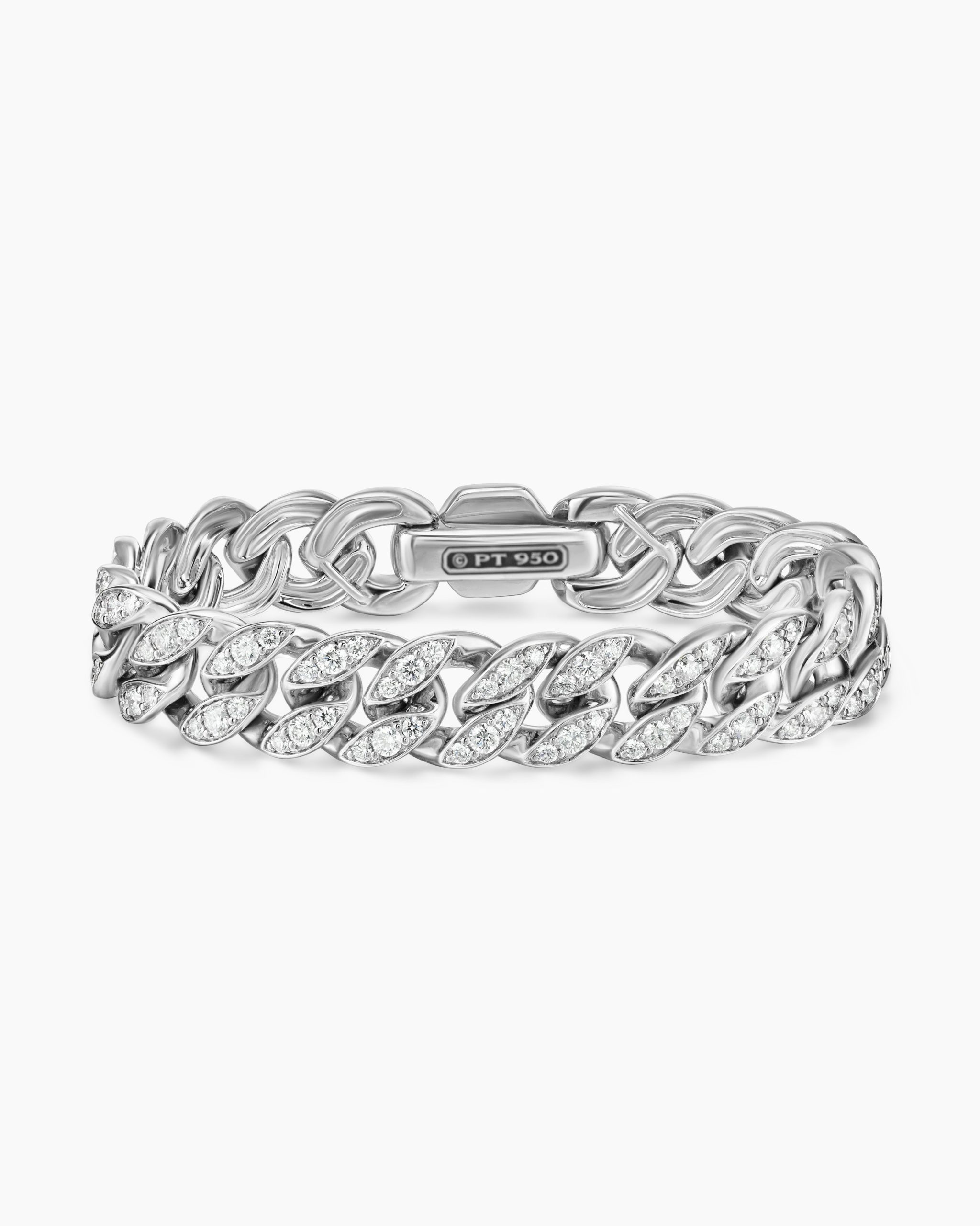 Inspired by David’s passion for horses, Curb Chain is the most elevated expression of our signature chain links. Its timeless elegance is rooted in the traditional equestrian bridle tack used to create control and stability during moments of speed. Forged precious metal is carved into Cable-like S-curves, each link crafted with impactful precision and hand-assembled with the next, culminating in a striking chain engineered for effortless movement.PlatinumPavé-set diamonds, total carat weight ranges from 4.37 – 5.78 (dependent on size)Bracelet, 11.5mmPush clasp