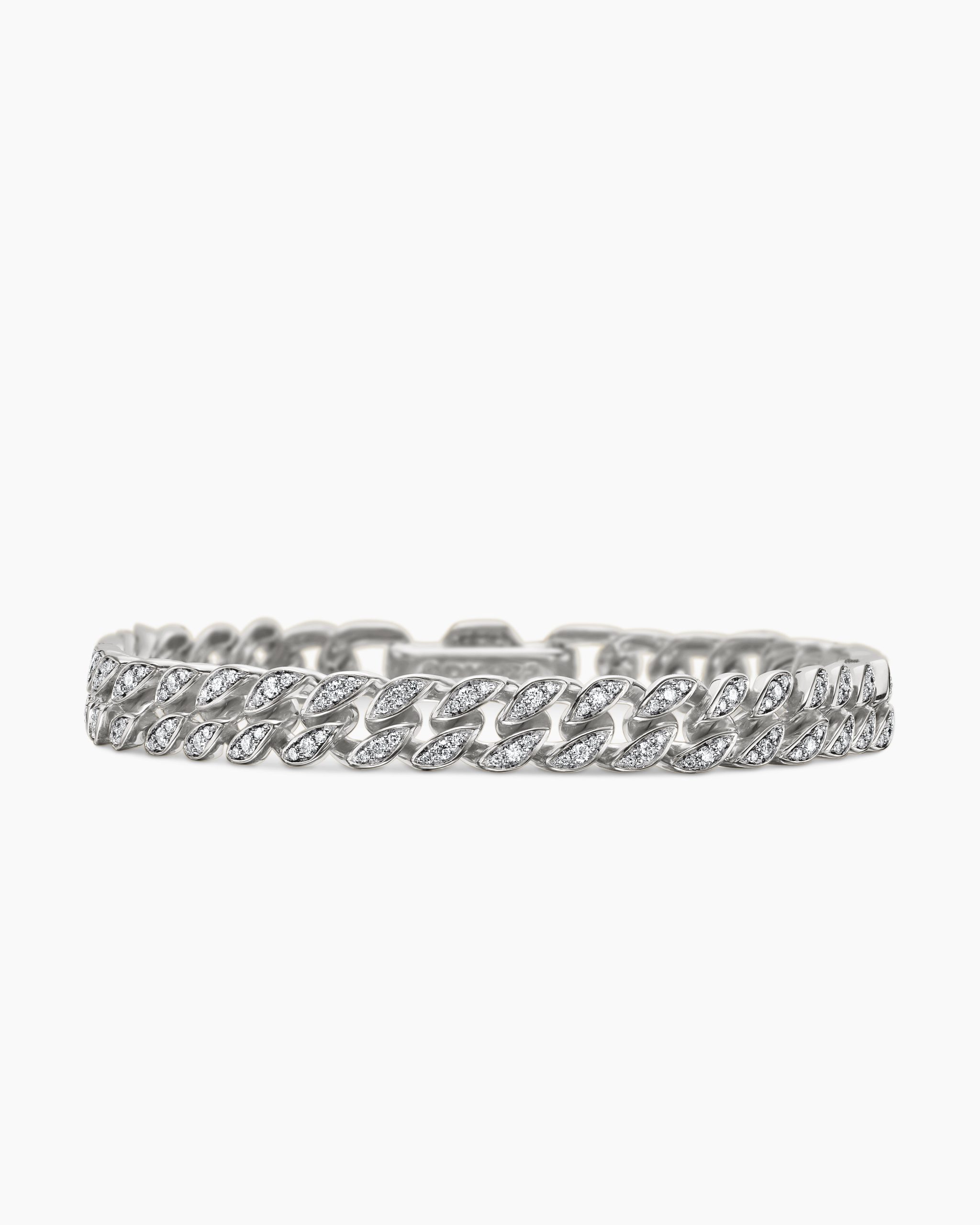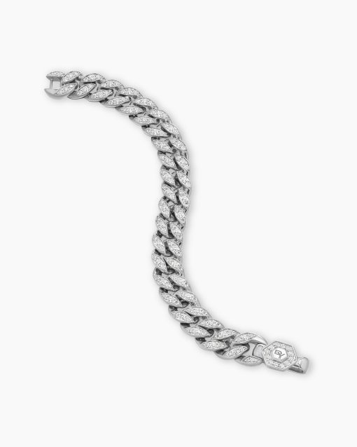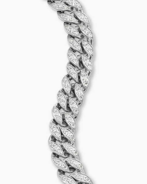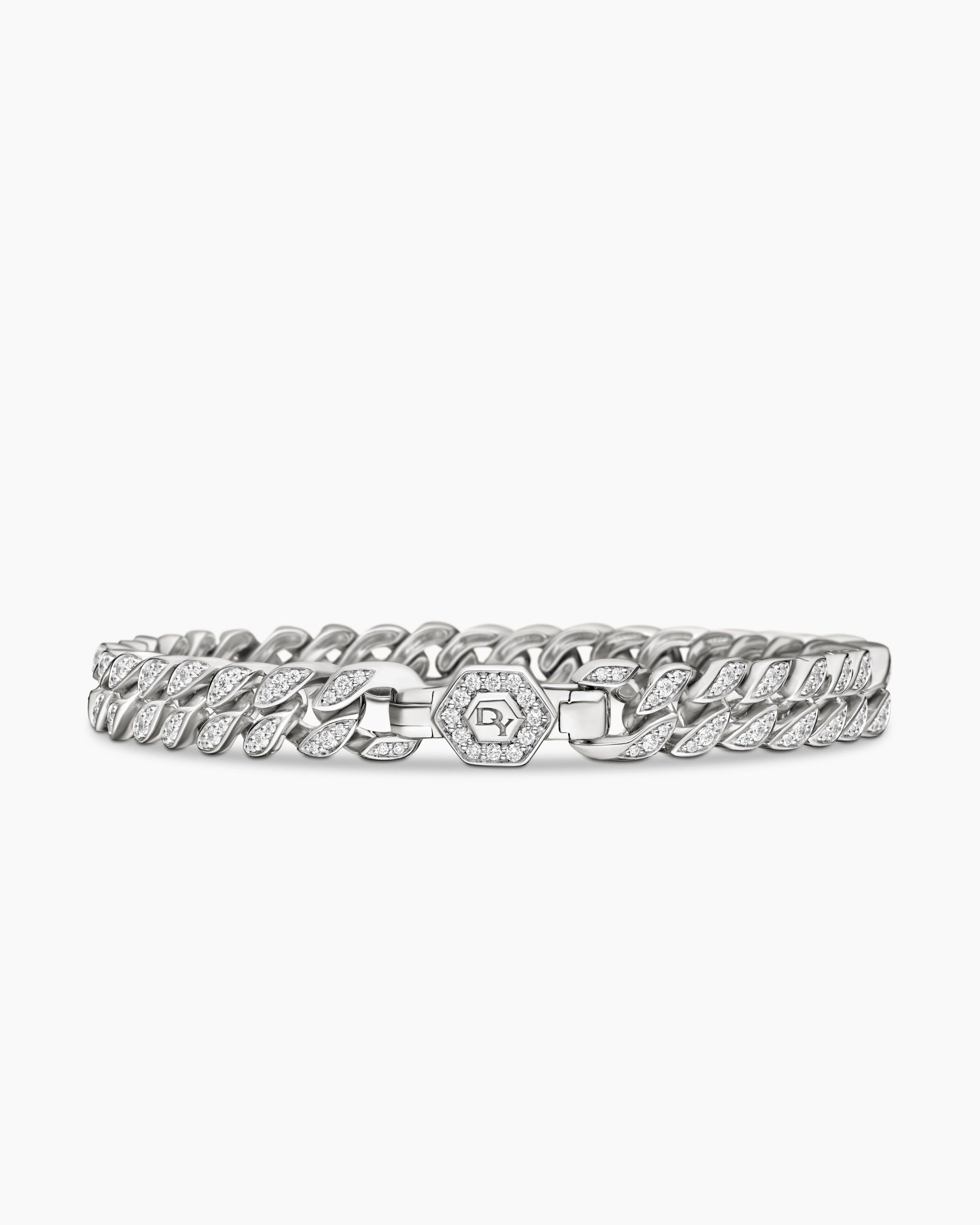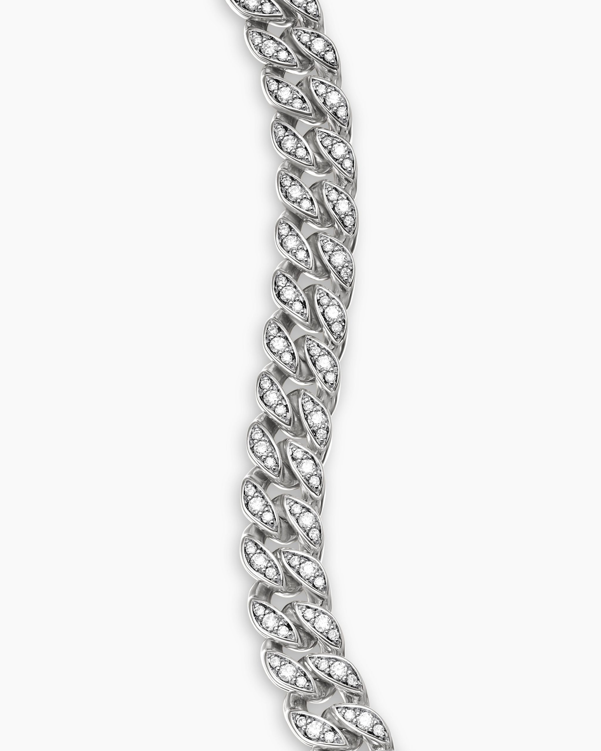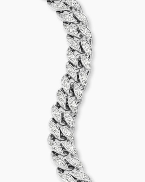 Inspired by David’s passion for horses, Curb Chain is the most elevated expression of our signature chain links. Its timeless elegance is rooted in the traditional equestrian bridle tack used to create control and stability during moments of speed. Forged precious metal is carved into Cable-like S-curves, each link crafted with impactful precision and hand-assembled with the next, culminating in a striking chain engineered for effortless movement.Sterling silverPavé-set diamonds, total carat weight ranges from 4.37 to 6.25 (dependent on size)Bracelet, 11.5mmPush clasp