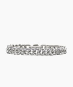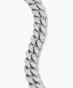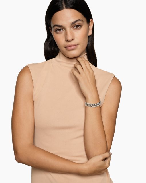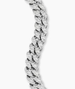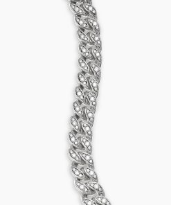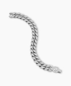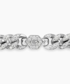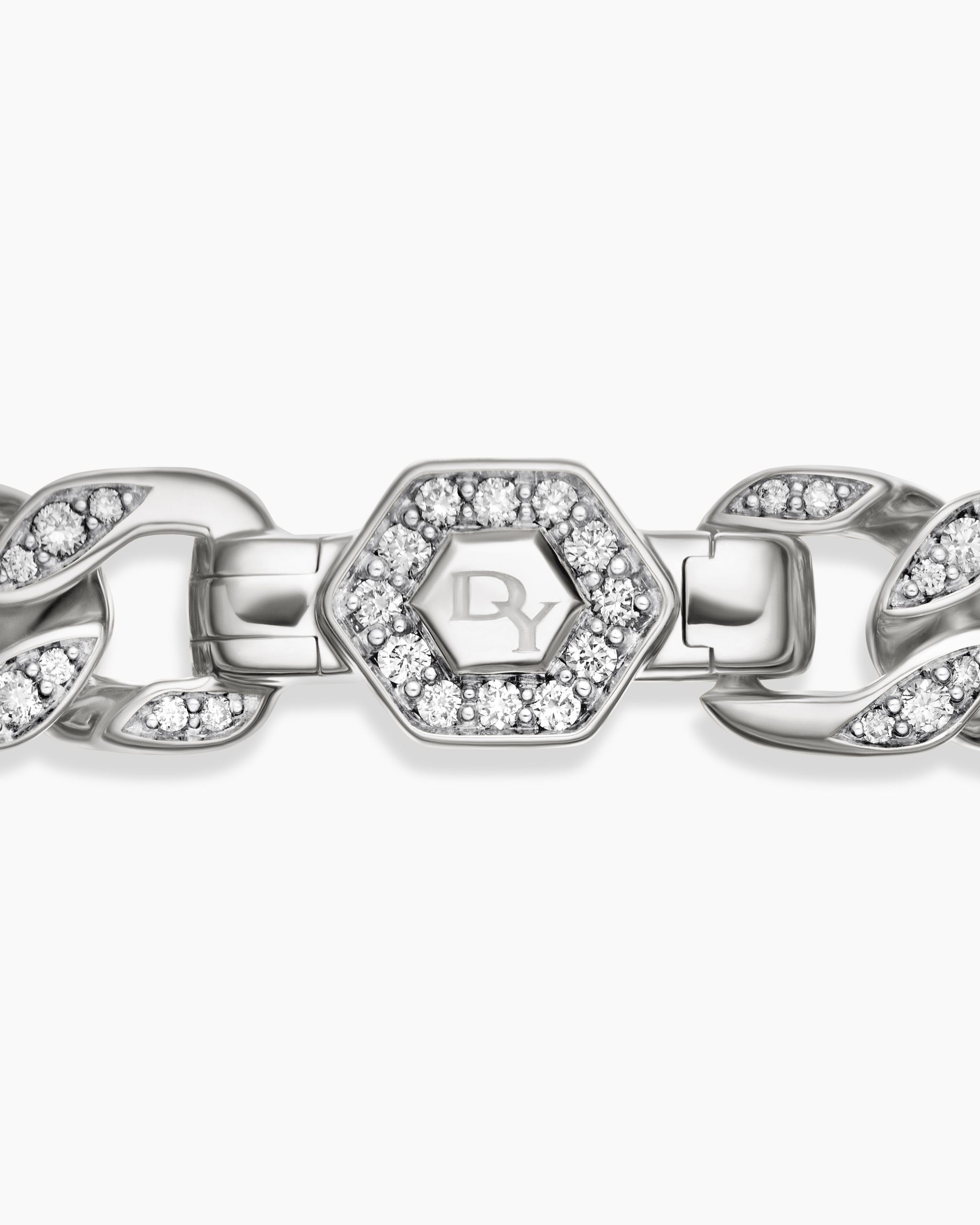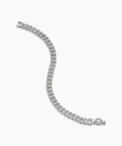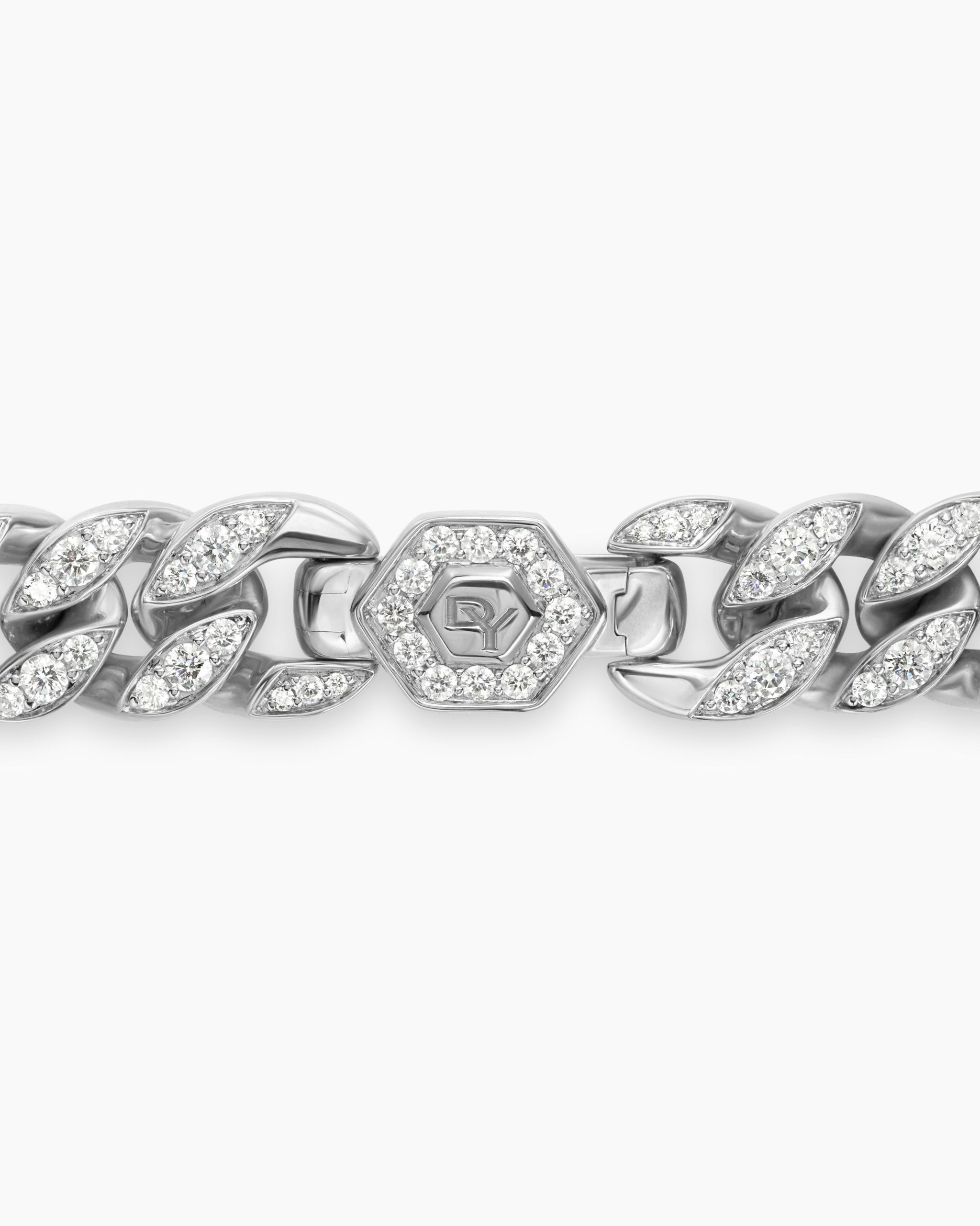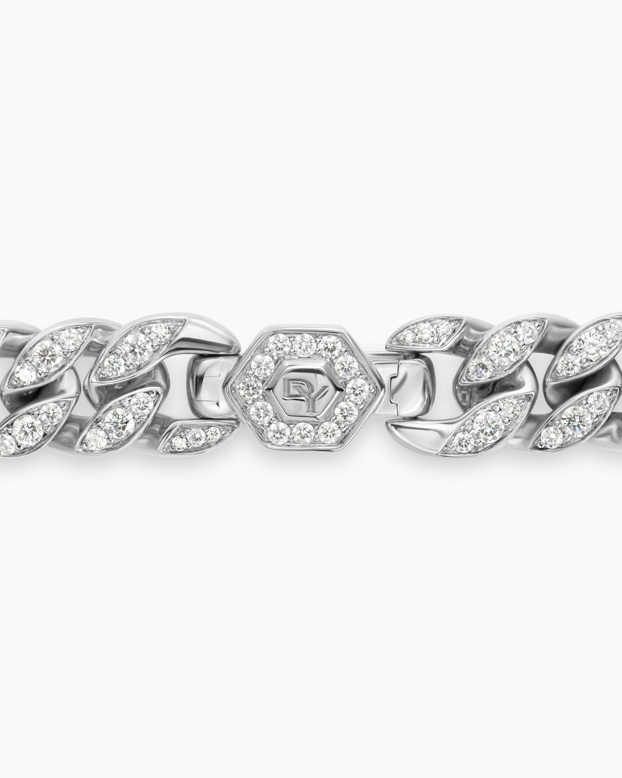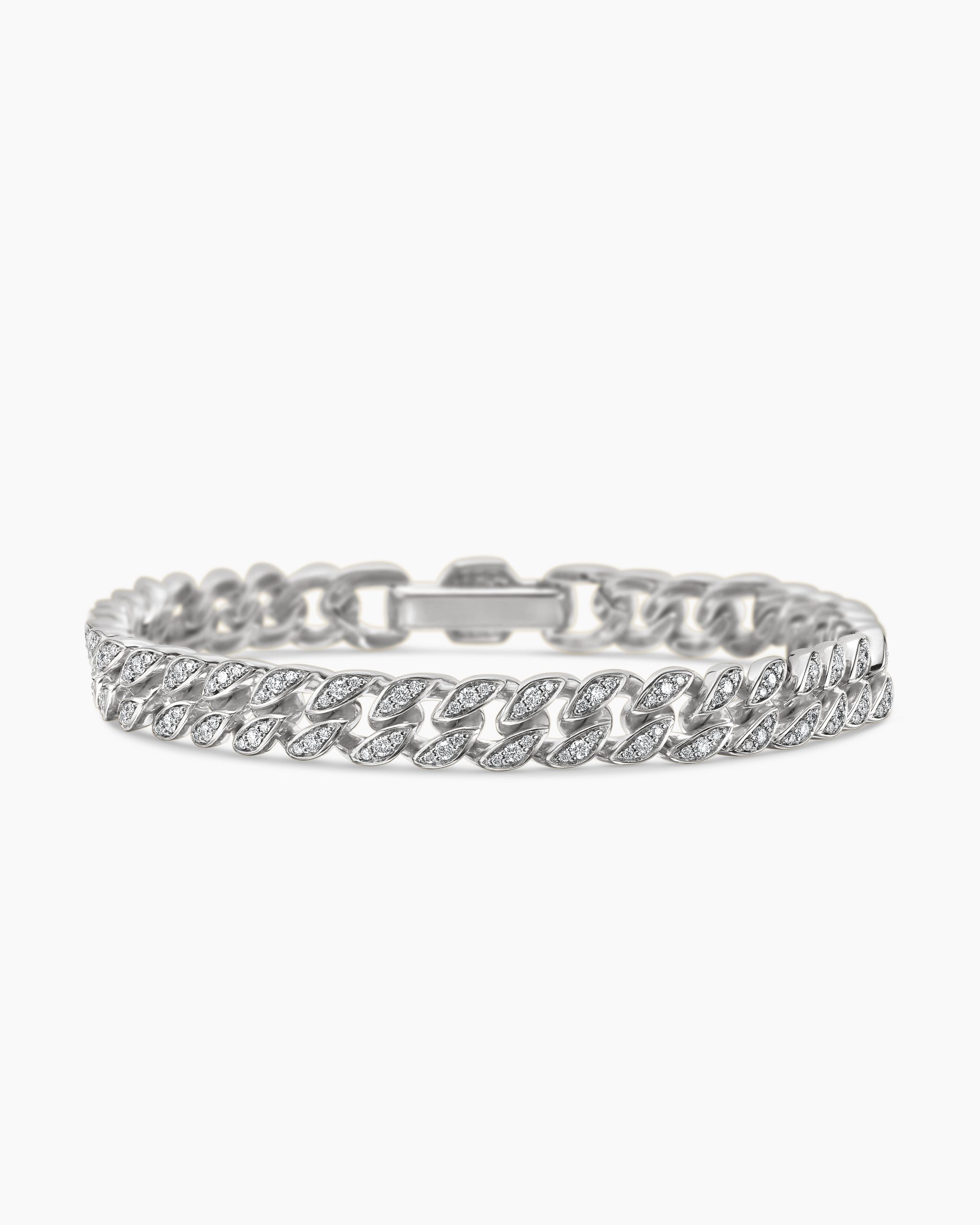 Inspired by David’s passion for horses, Curb Chain is the most elevated expression of our signature chain links. Its timeless elegance is rooted in the traditional equestrian bridle tack used to create control and stability during moments of speed. Forged precious metal is carved into Cable-like S-curves, each link crafted with impactful precision and hand-assembled with the next, culminating in a striking chain engineered for effortless movement.Sterling silverPavé-set diamonds, total carat weight ranges from 4.37 to 6.25 (dependent on size)Bracelet, 11.5mmPush clasp