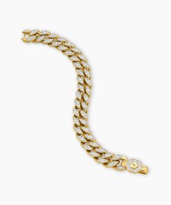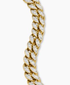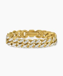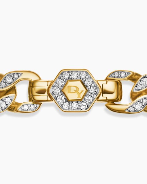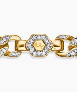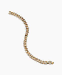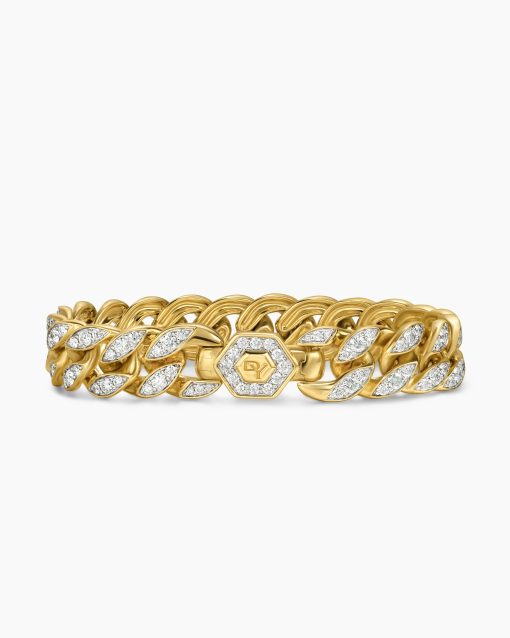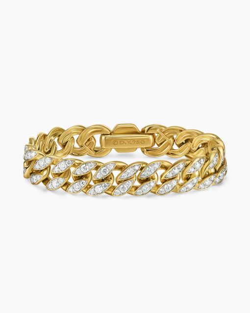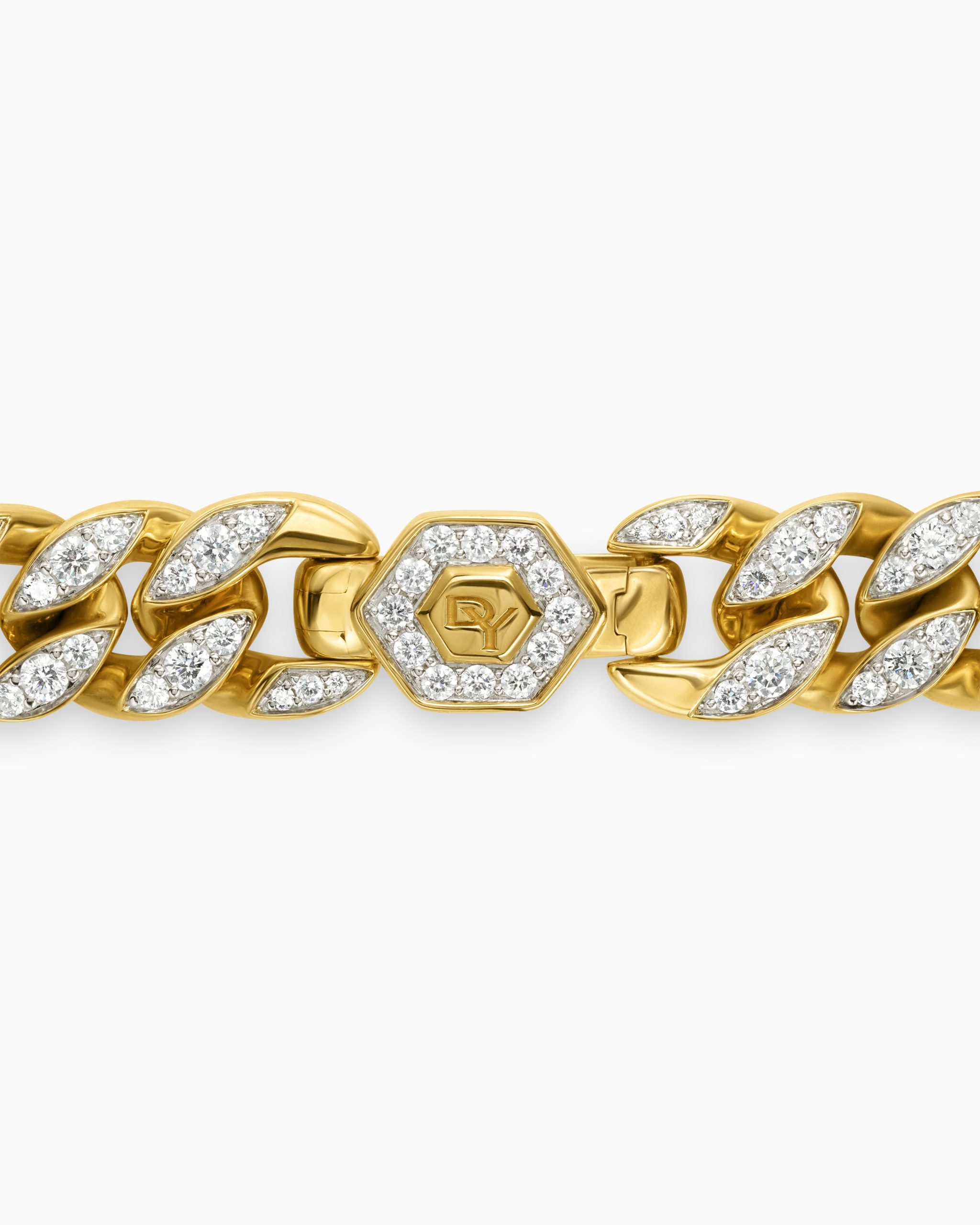 Inspired by David’s passion for horses, Curb Chain is the most elevated expression of our signature chain links. Its timeless elegance is rooted in the traditional equestrian bridle tack used to create control and stability during moments of speed. Forged precious metal is carved into Cable-like S-curves, each link crafted with impactful precision and hand-assembled with the next, culminating in a striking chain engineered for effortless movement.18-karat yellow goldPavé-set diamonds, total carat weight ranges from 4.37 to 6.25 (dependent on size)Bracelet, 11.5mmPush clasp