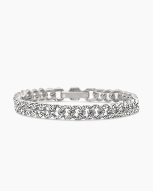 Inspired by David’s passion for horses, Curb Chain is the most elevated expression of our signature chain links. Its timeless elegance is rooted in the traditional equestrian bridle tack used to create control and stability during moments of speed. Forged precious metal is carved into Cable-like S-curves, each link crafted with impactful precision and hand-assembled with the next, culminating in a striking chain engineered for effortless movement.Sterling silverPavé-set diamonds, total carat weight ranges from 1.23 to 1.40 (dependent on size)Bracelet, 7mmPush clasp