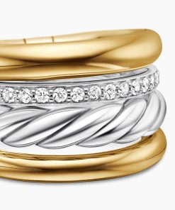 Inspired by SoHo’s historic art scene and galleries, DY Mercer® captures bold creativity and the spirit of New York. The collection channels a youthful energy with exaggerated oval links, unique toggle closures, and stacked silhouettes. Crafted in 18K gold and sterling silver with antique cushion-cut gems, these sculptural designs combine elevated artistry with an effortlessly modern feel.Sterling silver with 18-karat yellow goldPavé-set diamonds, total carat weight ranges from 0.24 to 0.30 (dependent on size)Ring, 13.8mm