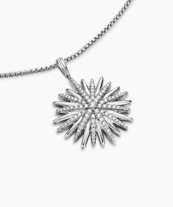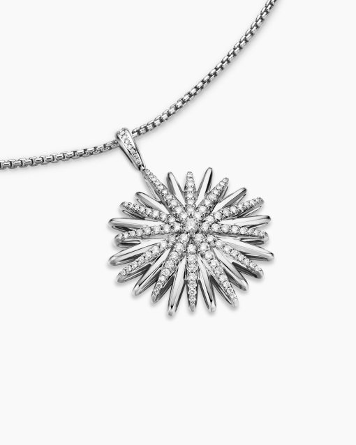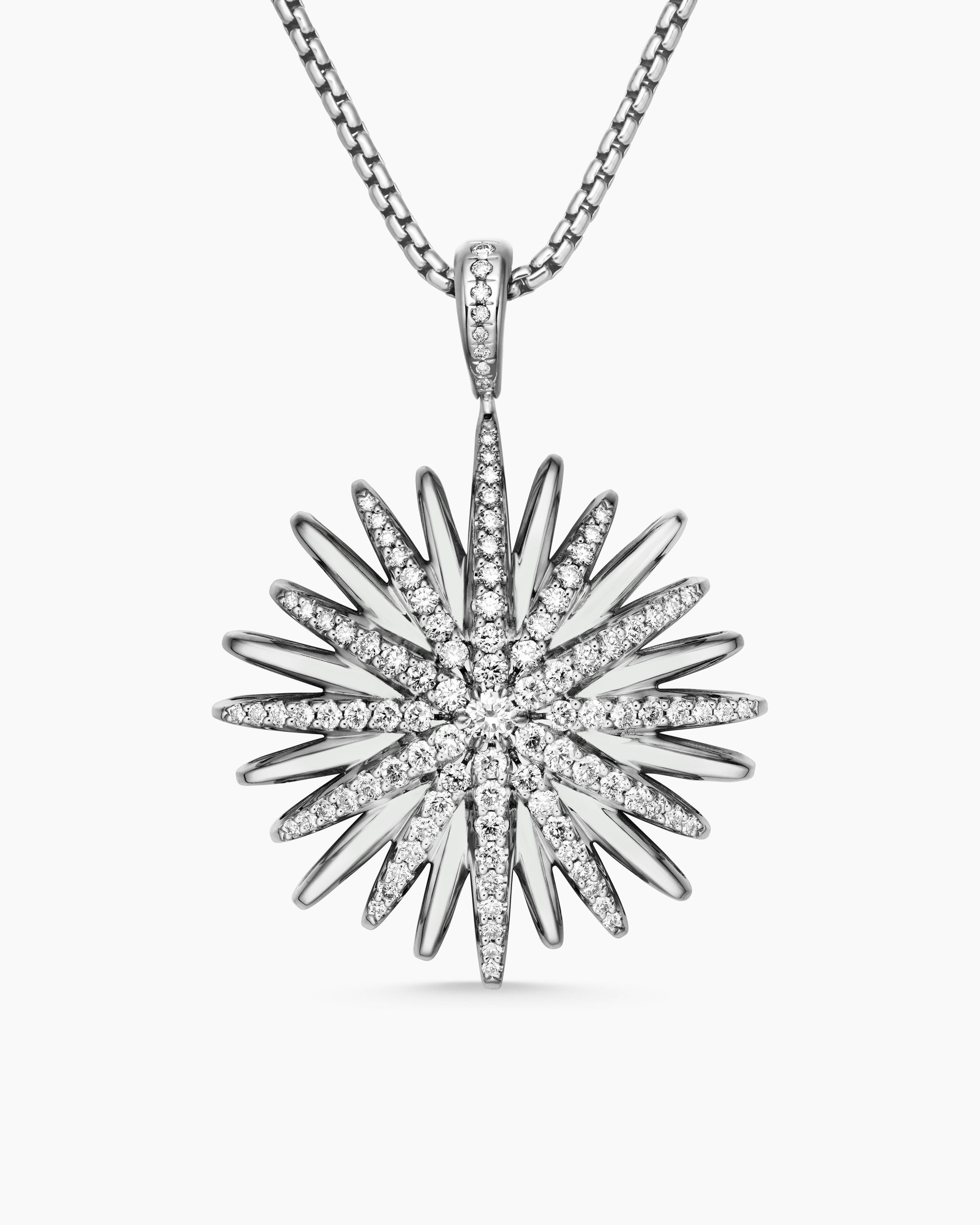 Starburst was born from David and Sybil Yurman’s experience watching fireworks illuminate the Paris night sky. The magical bursts of light greatly moved Sybil, inspiring David to create designs of brilliant star motifs. Sterling silverPavé diamonds, 1.19 total carat weightAdjustable length, 17-18inPendant, 32mmChain, 1.7mmLobster clasp