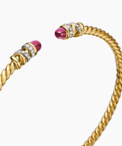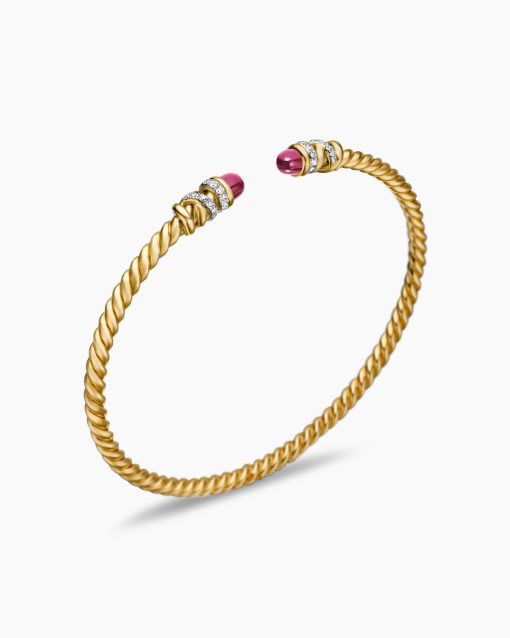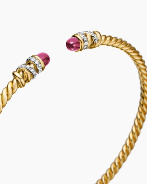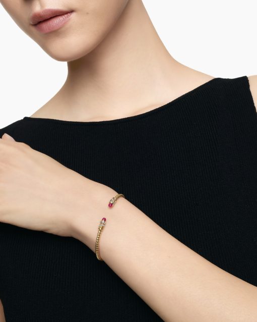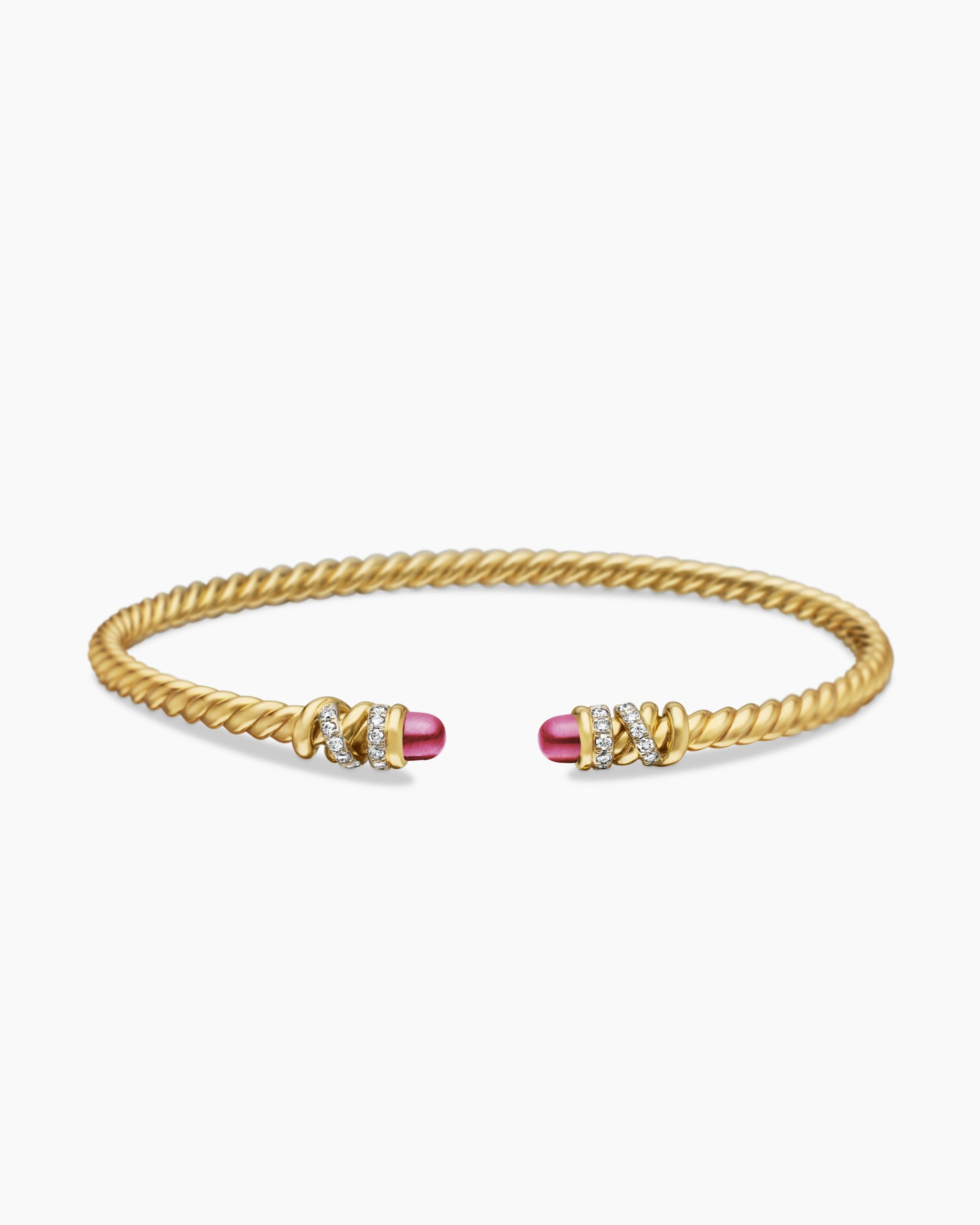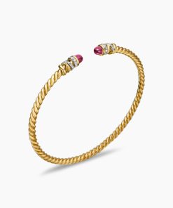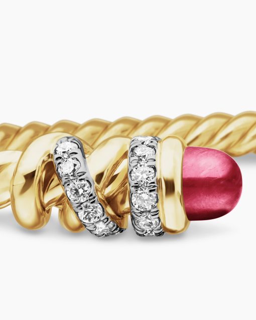 In the Helena Collection, David Yurman returns to the longer, leaner twist of his first handmade Cable bracelet, wrapping the iconic form with 18K yellow gold threads accented with hand-set pavé diamonds. 18-karat yellow goldRubies, 0.54 total carat weightPavé diamonds, 0.17 total carat weightBracelet, 3mmCablespira® is a patented DY construction that is highly flexible and exceptionally comfortable to wear.