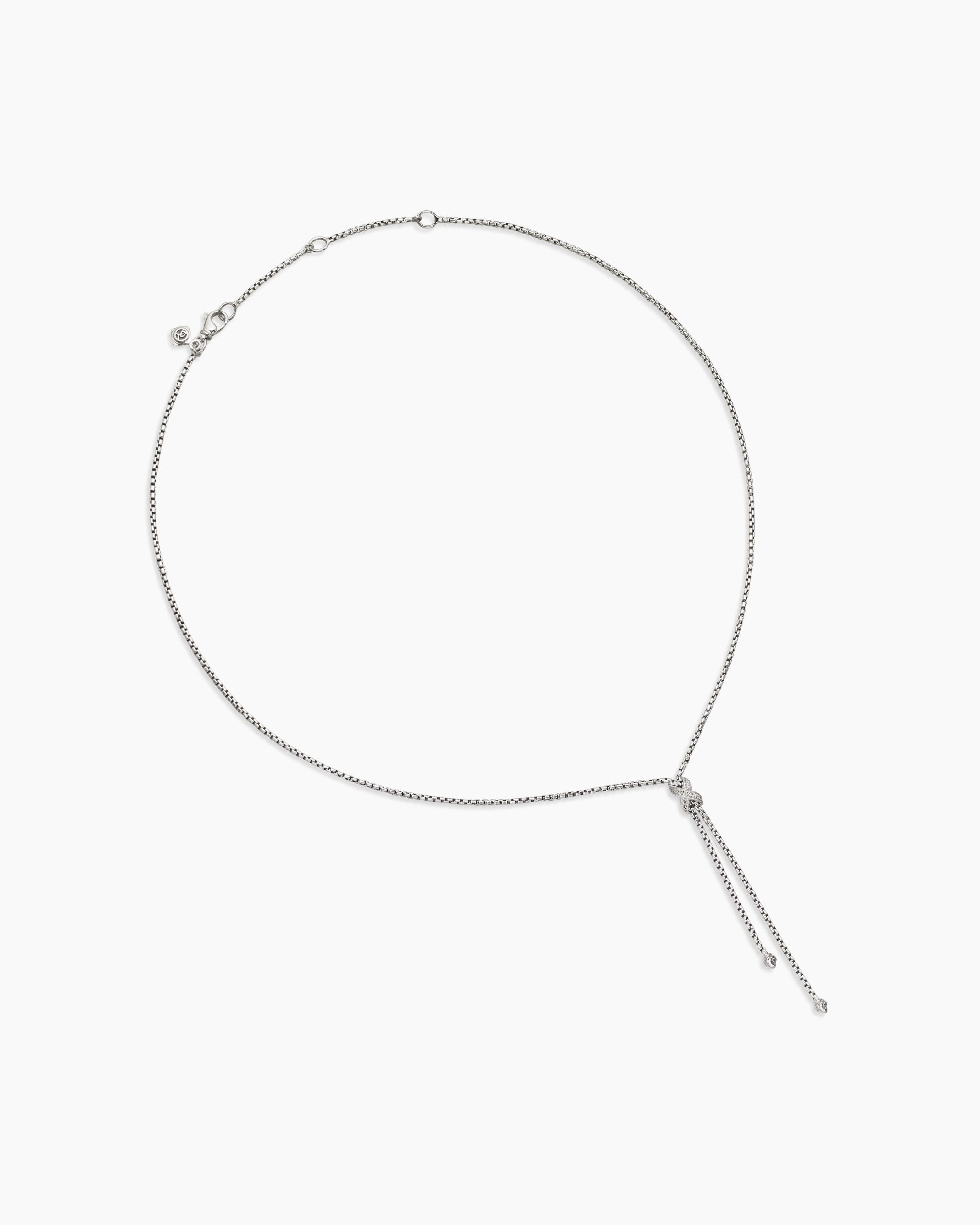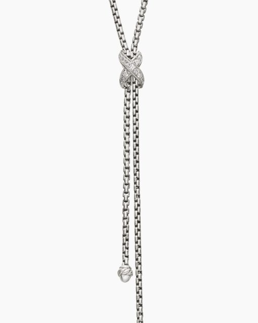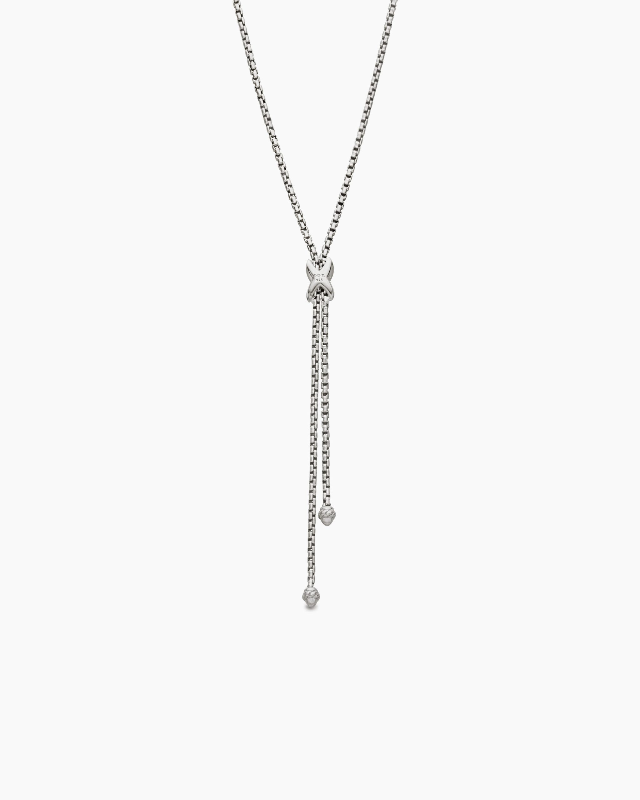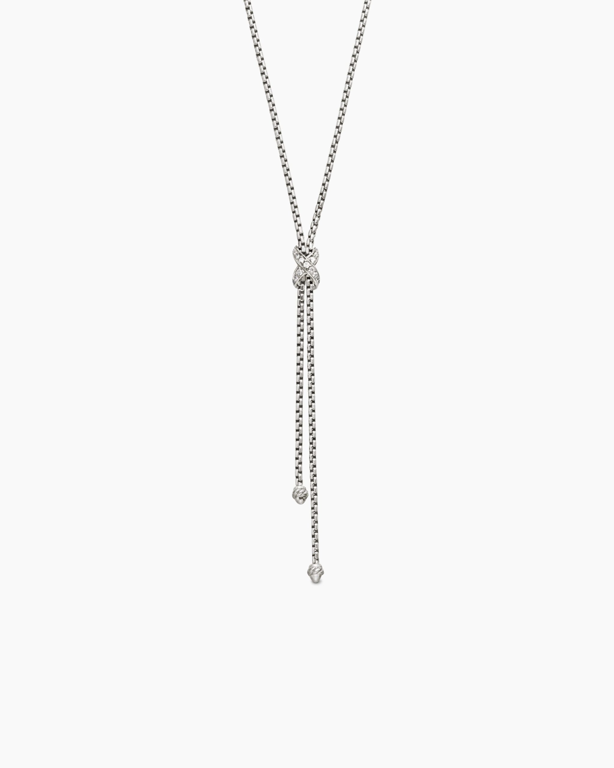 One of David Yurman’s most iconic designs, the X Collection was inspired by his wife Sybil’s painting of the ancient mark. Classic yet contemporary, the collection epitomizes his approach to design. Sterling silverPavé diamonds, 0.06 total carat weightAdjustable length, 17-18inDrop length, 1.63inChain, 1.5mmLobster clasp