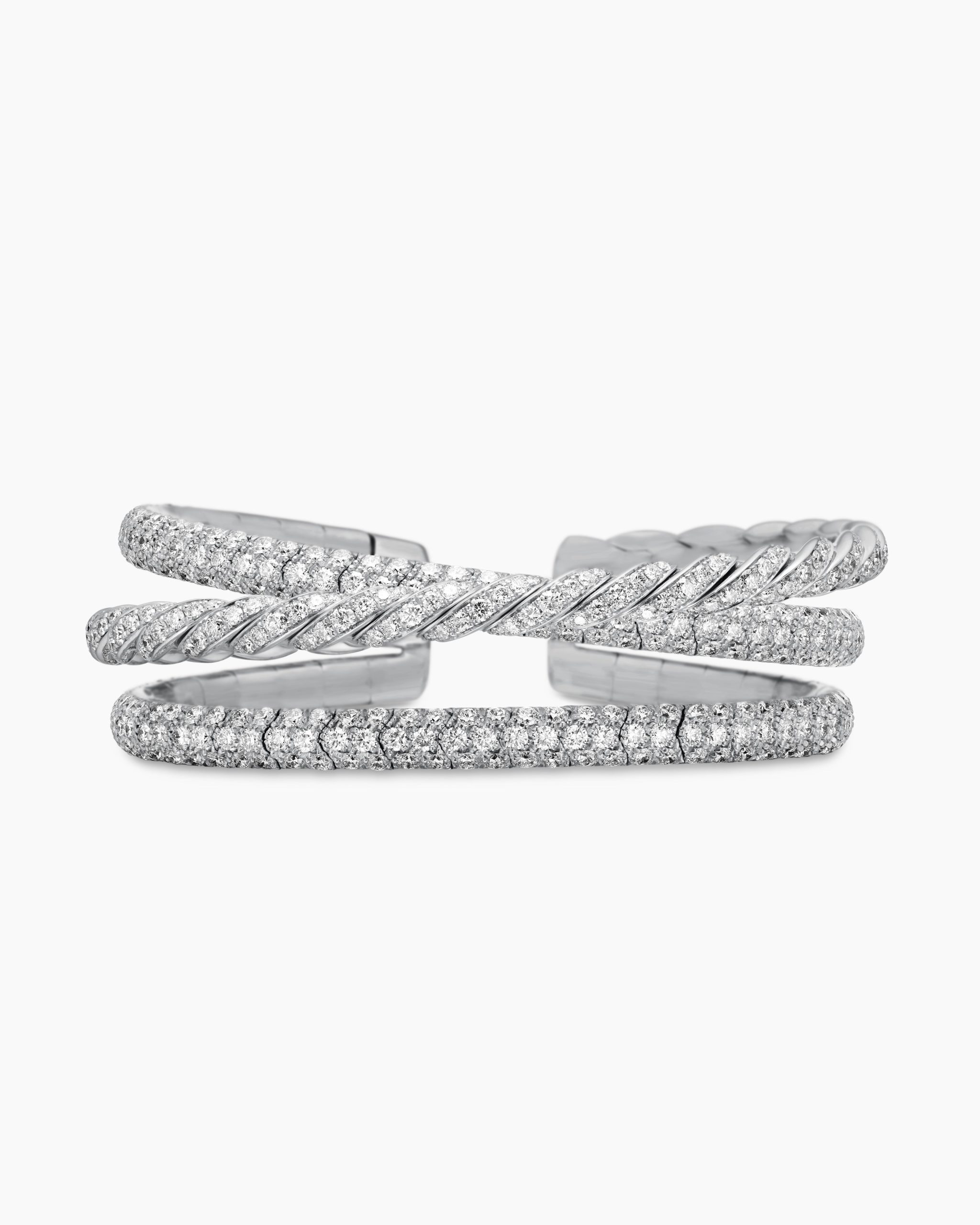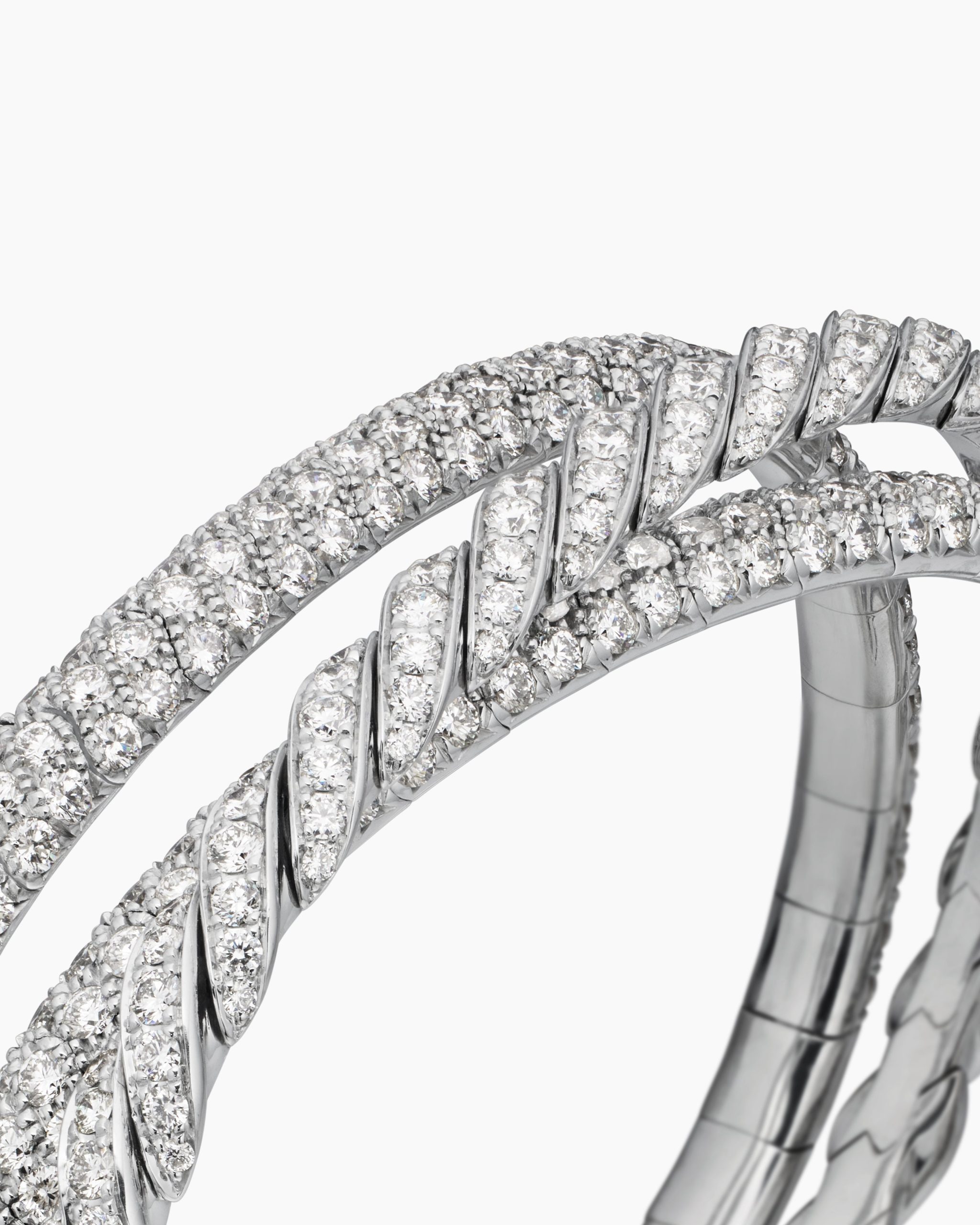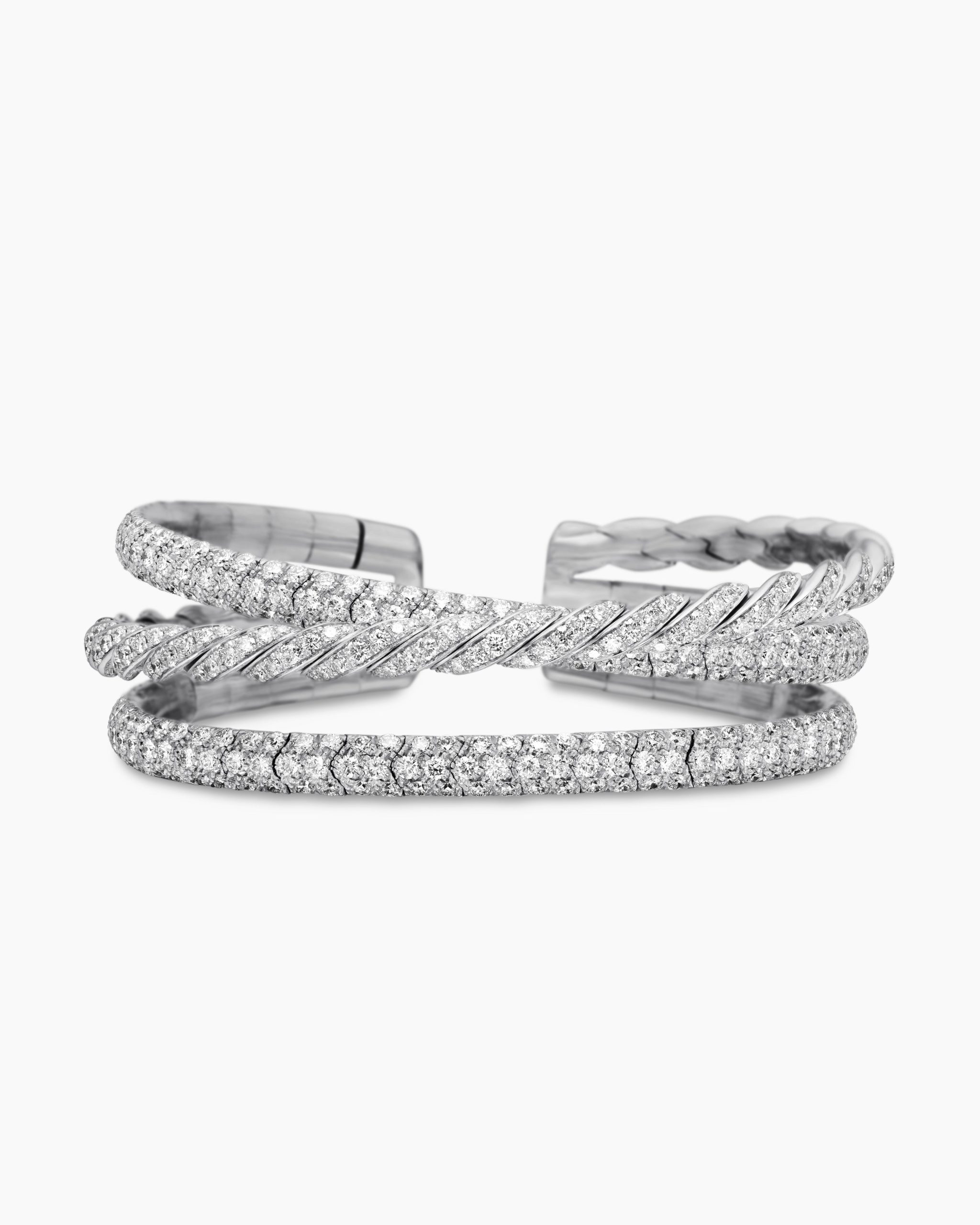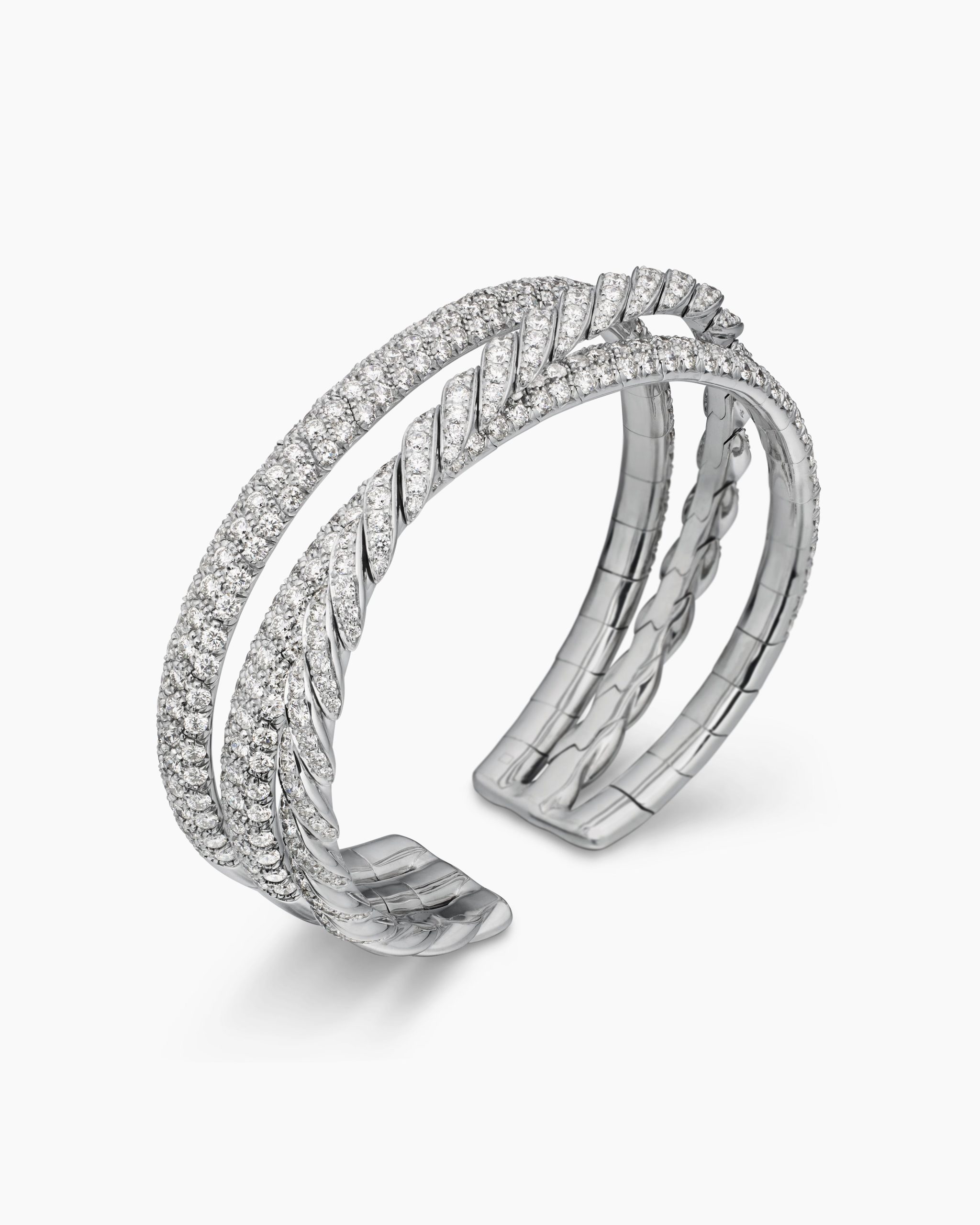 Inspired by his love of architecture and bas-relief sculpture, Evan Yurman designed this modern form by deconstructing Cable—the house’s signature motif—to its essence. Each design is a wearable work of art; precious metals are meticulously carved with exquisite wavelike patterns that dramatically catch the light. Elegant curves highlight the sensuality of the body, with pavé-set diamonds for a statement of added brilliance.18-karat white goldPavé-set diamonds, 9.53 total carat weightBracelet, 18.5mmState-of-the-art flexibility delivers exceptional comfort and ease of wear.
