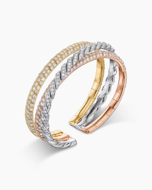 Through innovative engineering, this Pavéflex® design twists and moves with ease while never forgetting its elegant form. An opening in the back allows it to expand to fit a range of sizes. 18-karat yellow, white and rose goldPavé diamonds, 9.53 total carat weightBracelet, 18.5mmState-of-the-art flexibility delivers exceptional comfort and ease of wear.