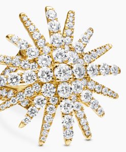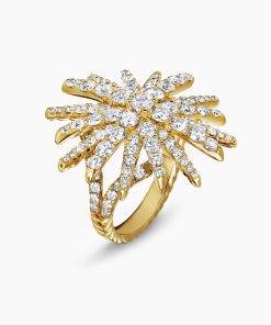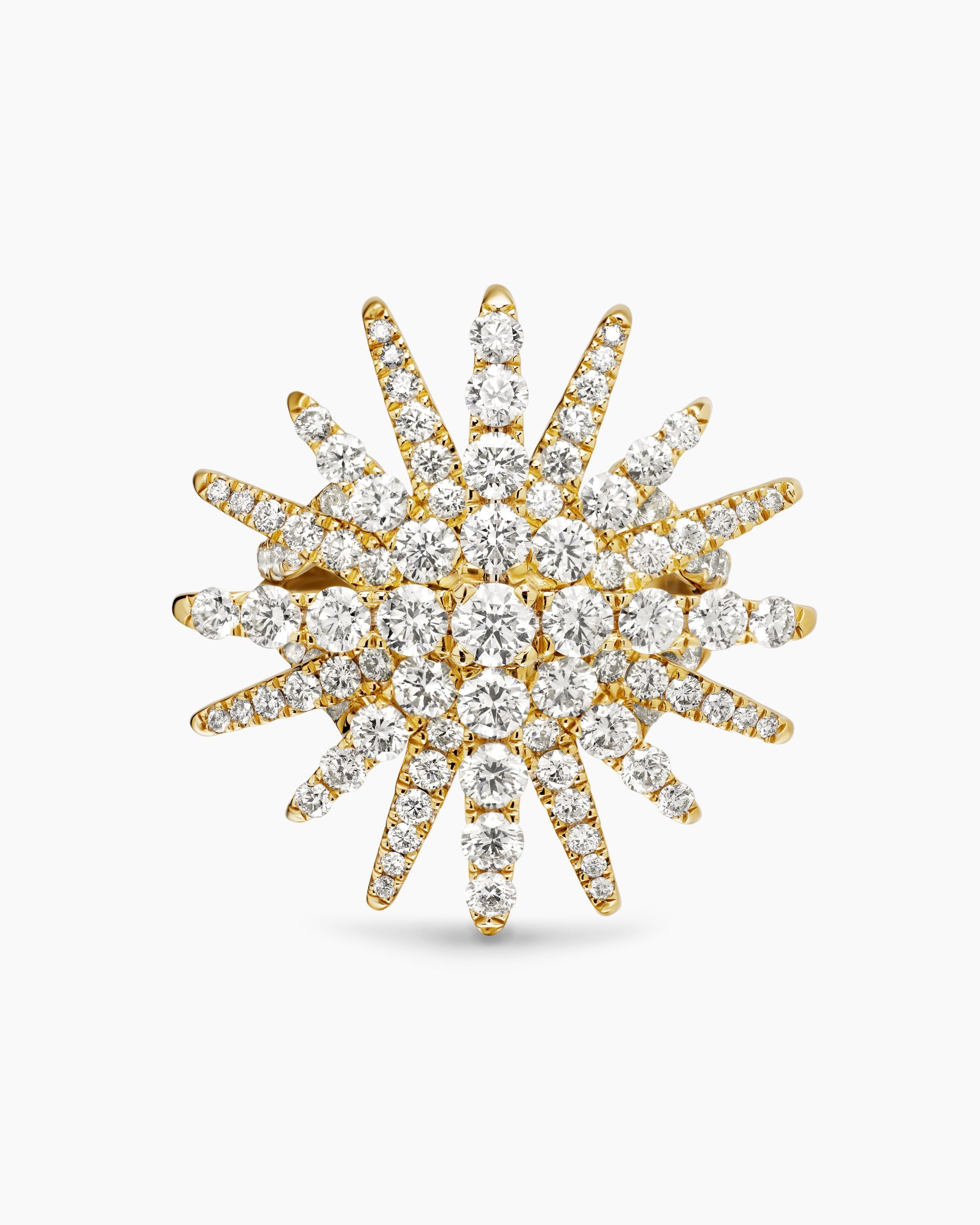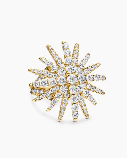 Starburst was born from David and Sybil Yurman’s experience watching fireworks illuminate the Paris night sky. The magical bursts of light greatly moved Sybil, inspiring David to create designs of brilliant star motifs. 18-karat yellow goldPavé diamonds, 2.75 total carat weightRing, 28mm