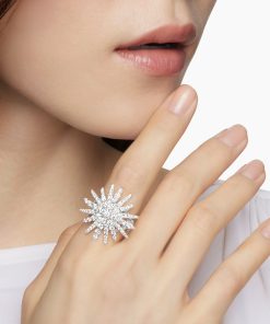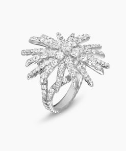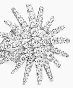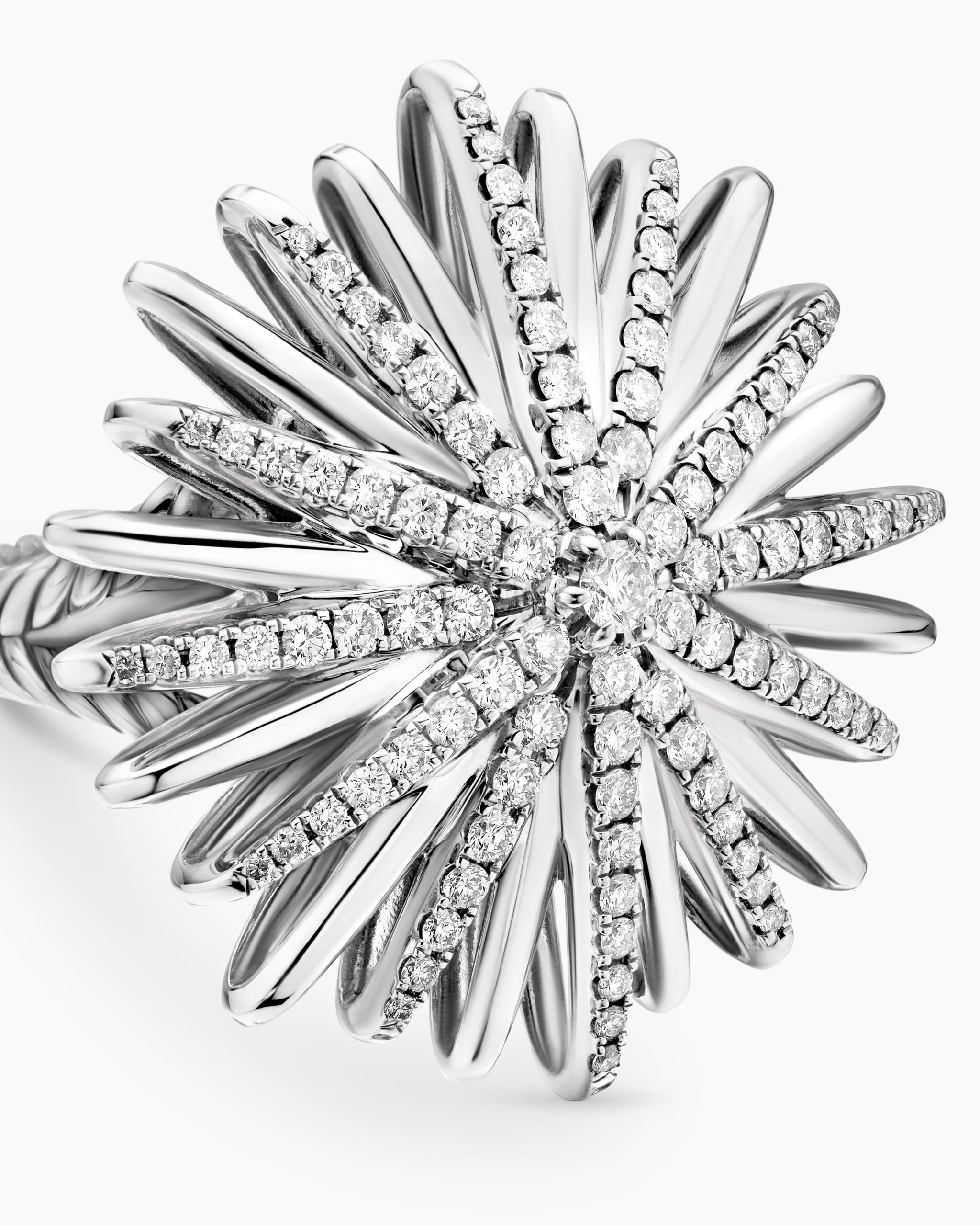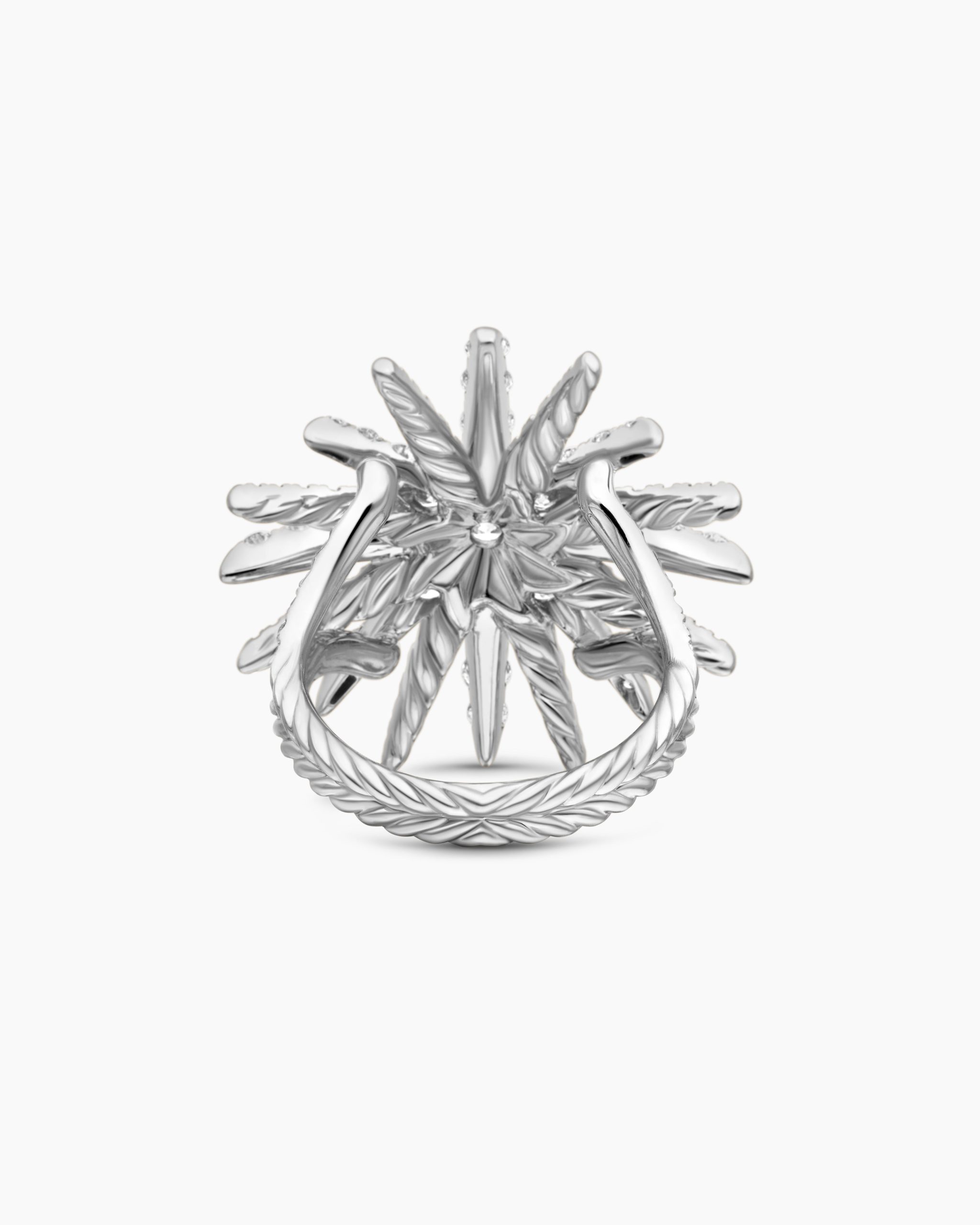 Starburst was born from David and Sybil Yurman’s experience watching fireworks illuminate the Paris night sky. The magical bursts of light greatly moved Sybil, inspiring David to create designs of brilliant star motifs. 18-karat white goldPavé diamonds, 2.75 total carat weightRing, 28mm