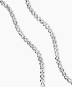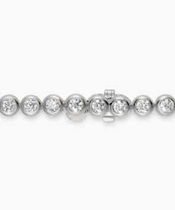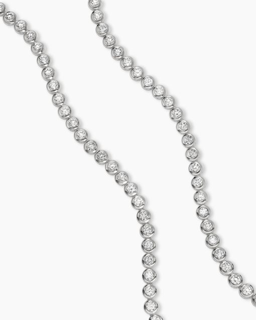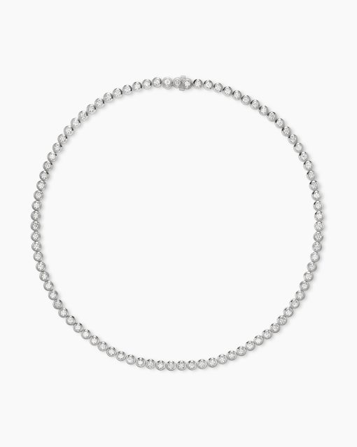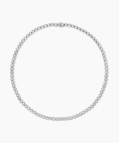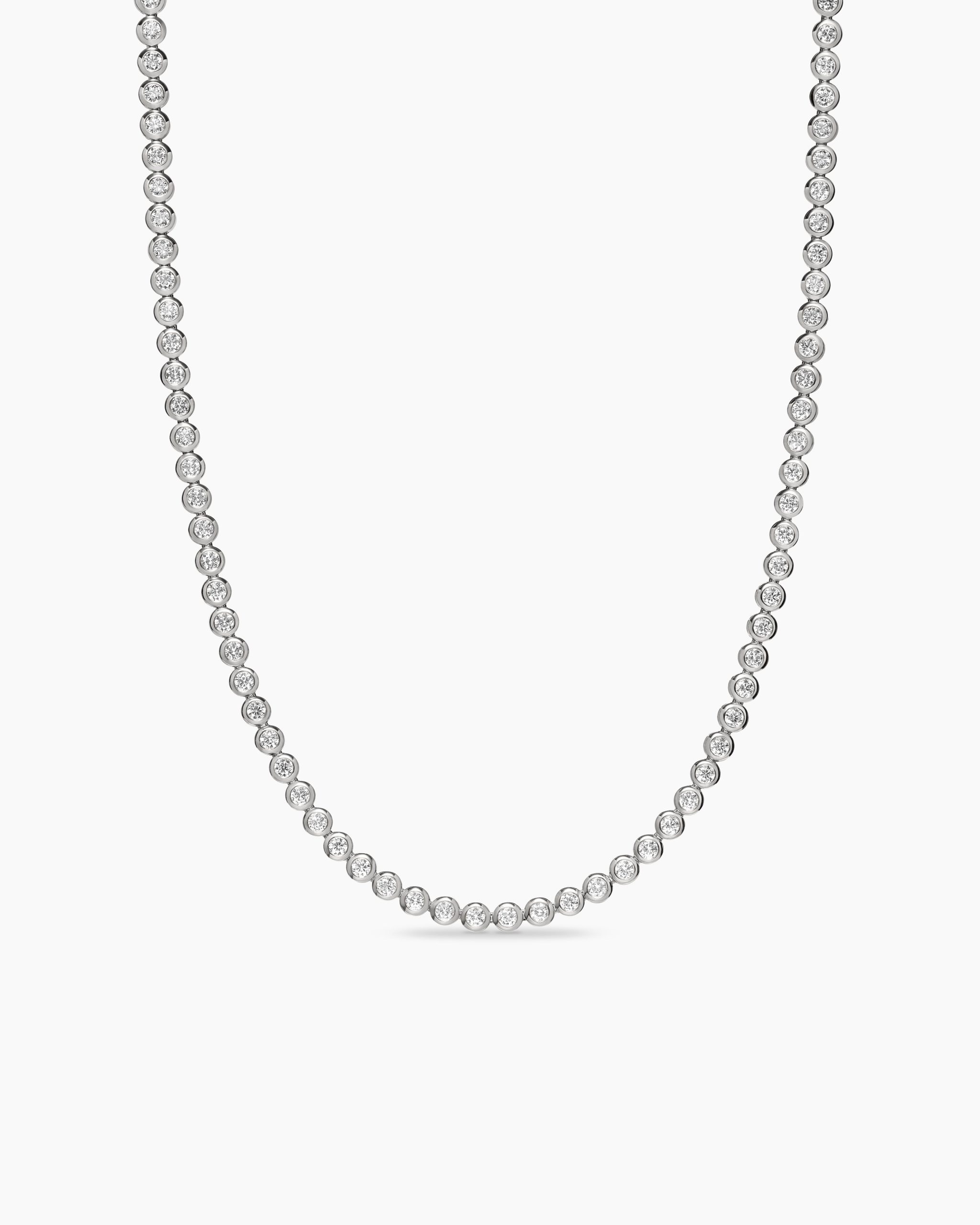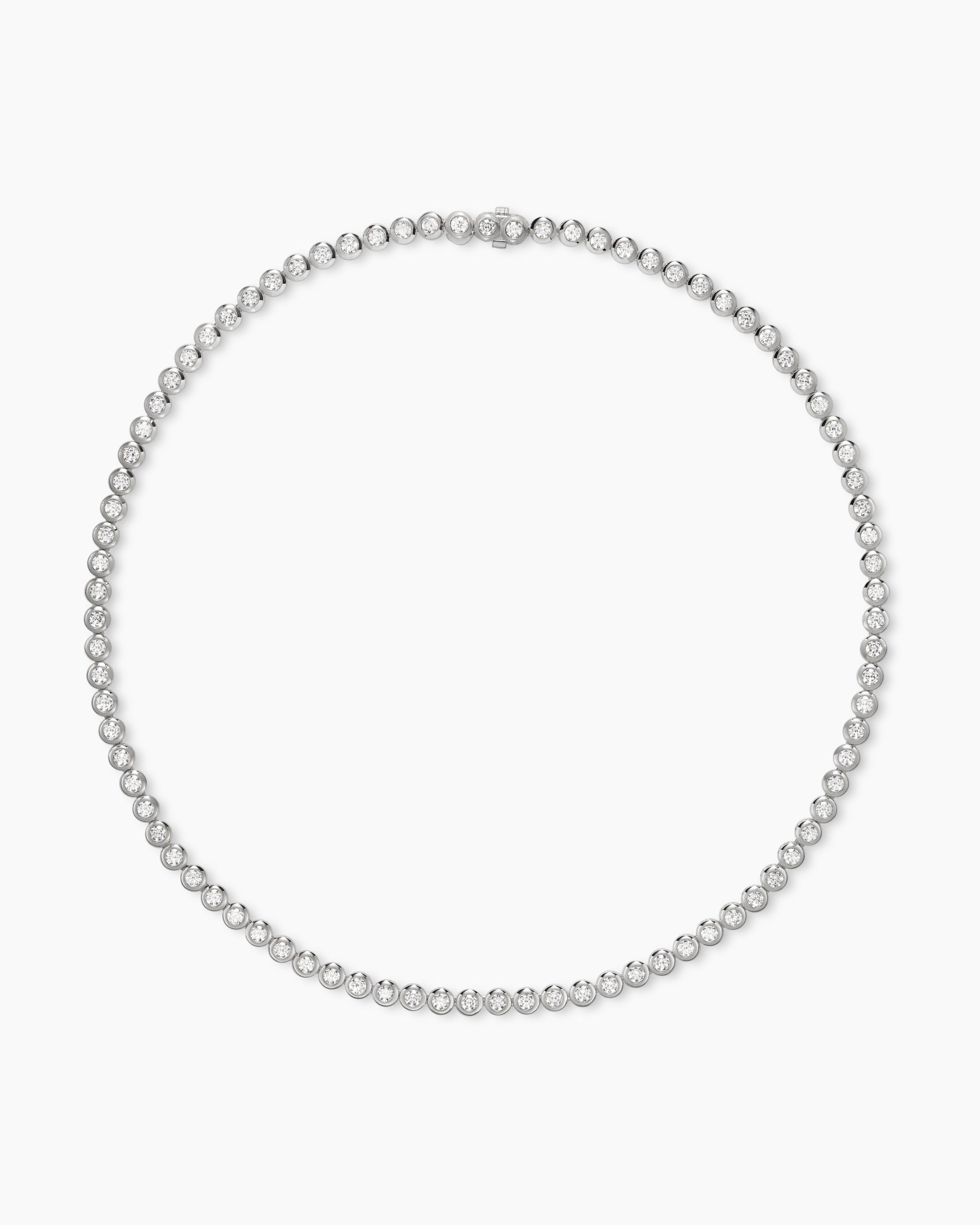 Ever since Chris Evert’s diamond bracelet flew off her wrist at the 1978 US Open, this style has been known as a “tennis bracelet”—a continuous line of bezel or prong-set diamonds. Now expanded to include necklaces, our elegant new additions come in both 18K yellow and white gold with hand-set stones. 18-karat white goldBezel-set diamonds, 8.79 total carat weightNecklace, 4.7mmPush clasp