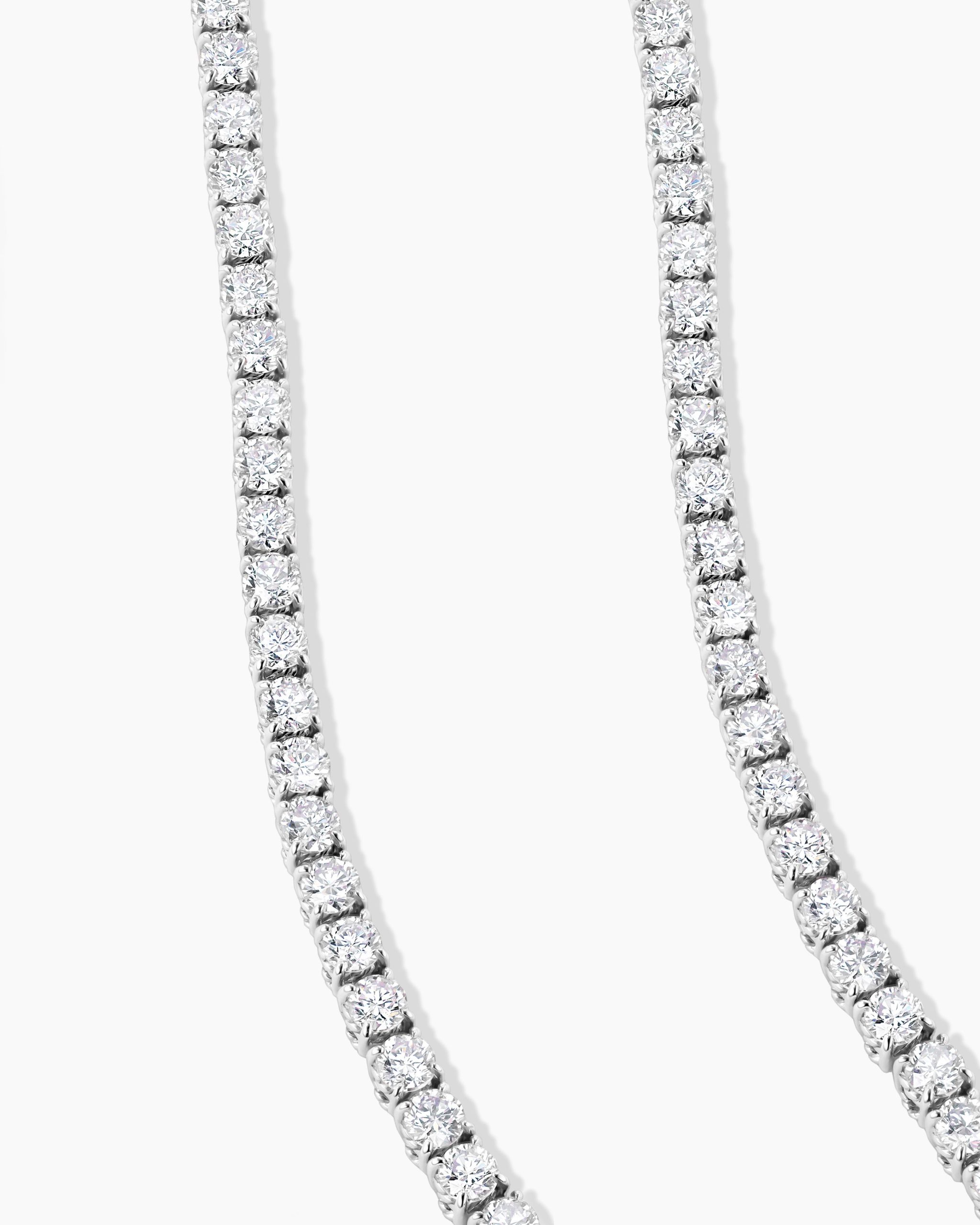 Ever since Chris Evert’s diamond bracelet flew off her wrist at the 1978 US Open, this style has been known as a “tennis bracelet”—a continuous line of bezel or prong-set diamonds. Now expanded to include necklaces, our elegant new additions come in both 18K yellow and white gold with hand-set stones. 18-karat white goldProng-set, diamonds, 14.44 total carat weightNecklace, 3mmPush clasp