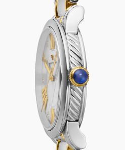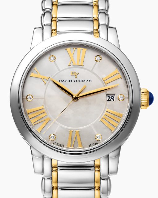 Quintessential American design meets Swiss precision in this meticulously crafted timepiece. Sterling silver with 18-karat yellow goldMother of pearlSapphireWatch face, 38mm
